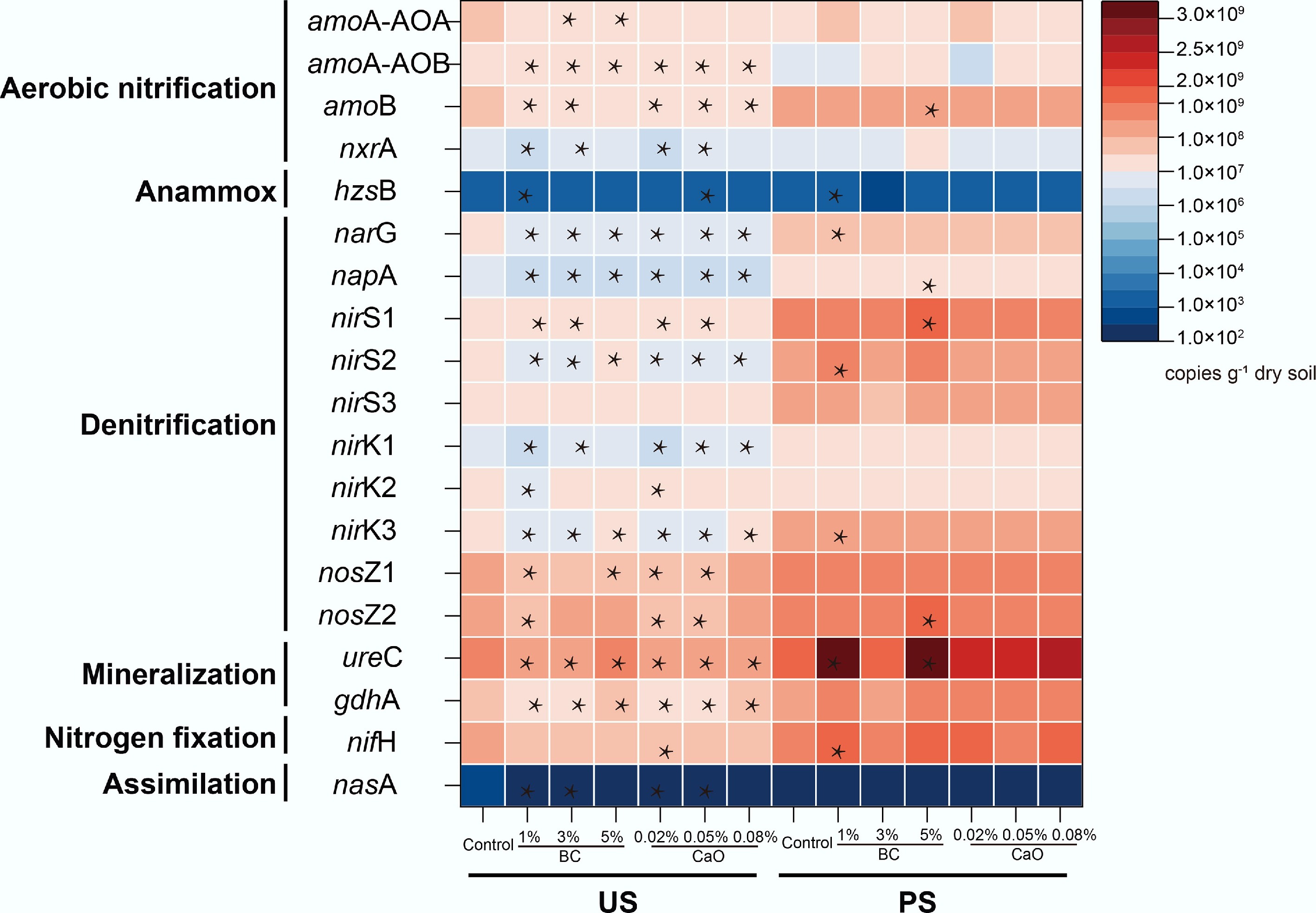 Soil nitrogen cycling related functional gene abundance after biochar or CaO addition in two studied soils; the color of the block represents the functional gene abundance in nitrogen transformation. * Indicate the statistical significance with significance levels of p < 0.05. BC, Biochar; CaO, lime; US, upland soil; PS, paddy soil.