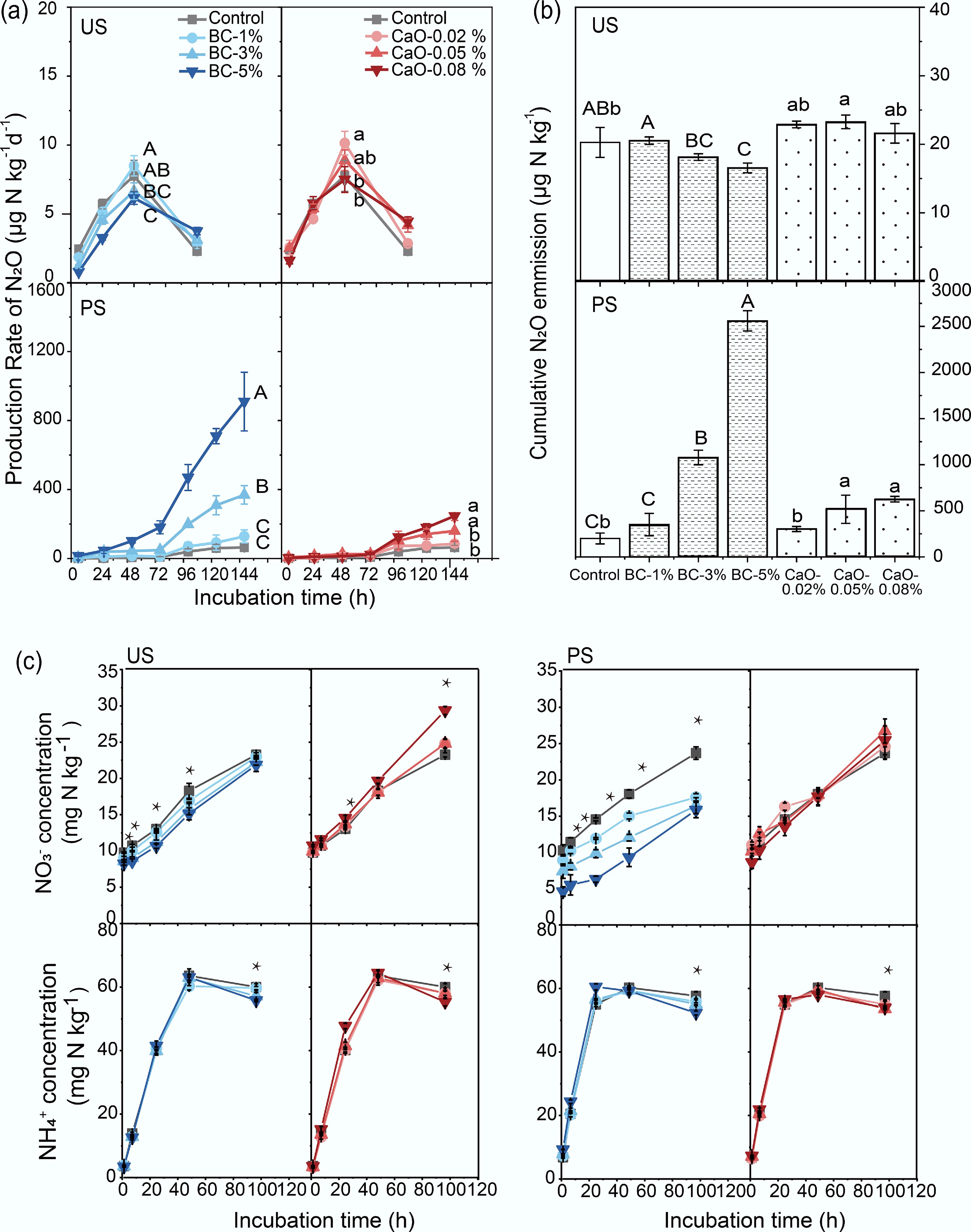 Dynamics of (a) soil N2O production rate, and (b) cumulative soil N2O emission, and (c) inorganic nitrogen concentrations after biochar or CaO addition in two studied soils. Error bars indicate the standard deviations of the means (n = 3). Different capital letters indicate significant differences between BC treatments in the same soil (p < 0.05); different lowercase letters indicate significant differences between CaO treatments in the same soil (p < 0.05). * Indicate statistical significance at p < 0.05. BC, Biochar; CaO, lime; US, upland soil; PS, paddy soil.