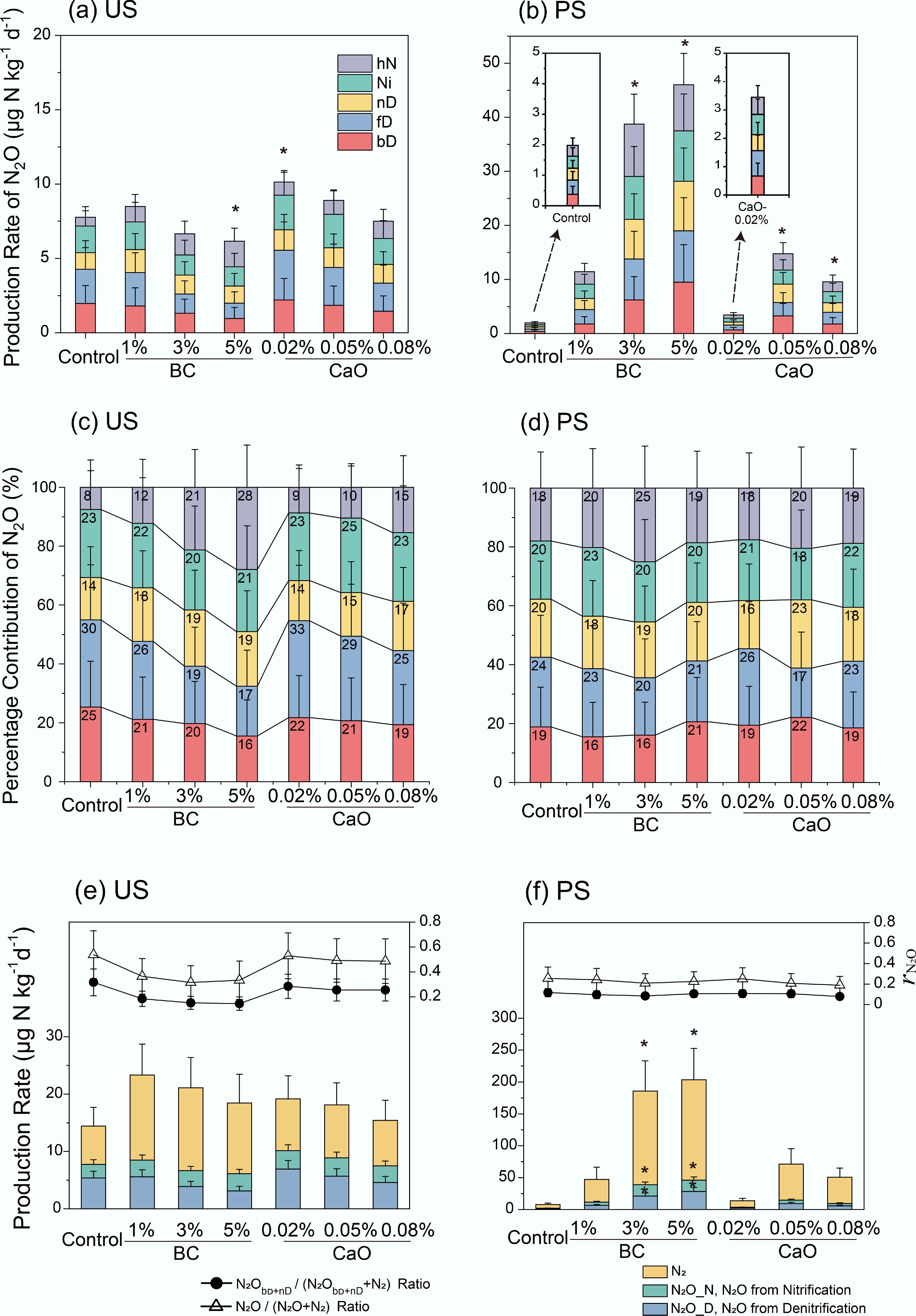 (a), (b) N2O production from soil N2O pathways, (c), (d) their percentage contribution to total N2O emission, and (e), (f) N2O/N2 production rate (column) and the proportion of N2O after biochar or CaO addition in two studied soils. bD, bacterial denitrification; fD, fungal denitrification; nD, nitrifier denitrification; Ni, nitrification; hN, heterotrophic nitrification. * Indicate the statistical significance with significance levels of p < 0.05. BC, Biochar; CaO, lime; US, upland soil; PS, paddy soil.
