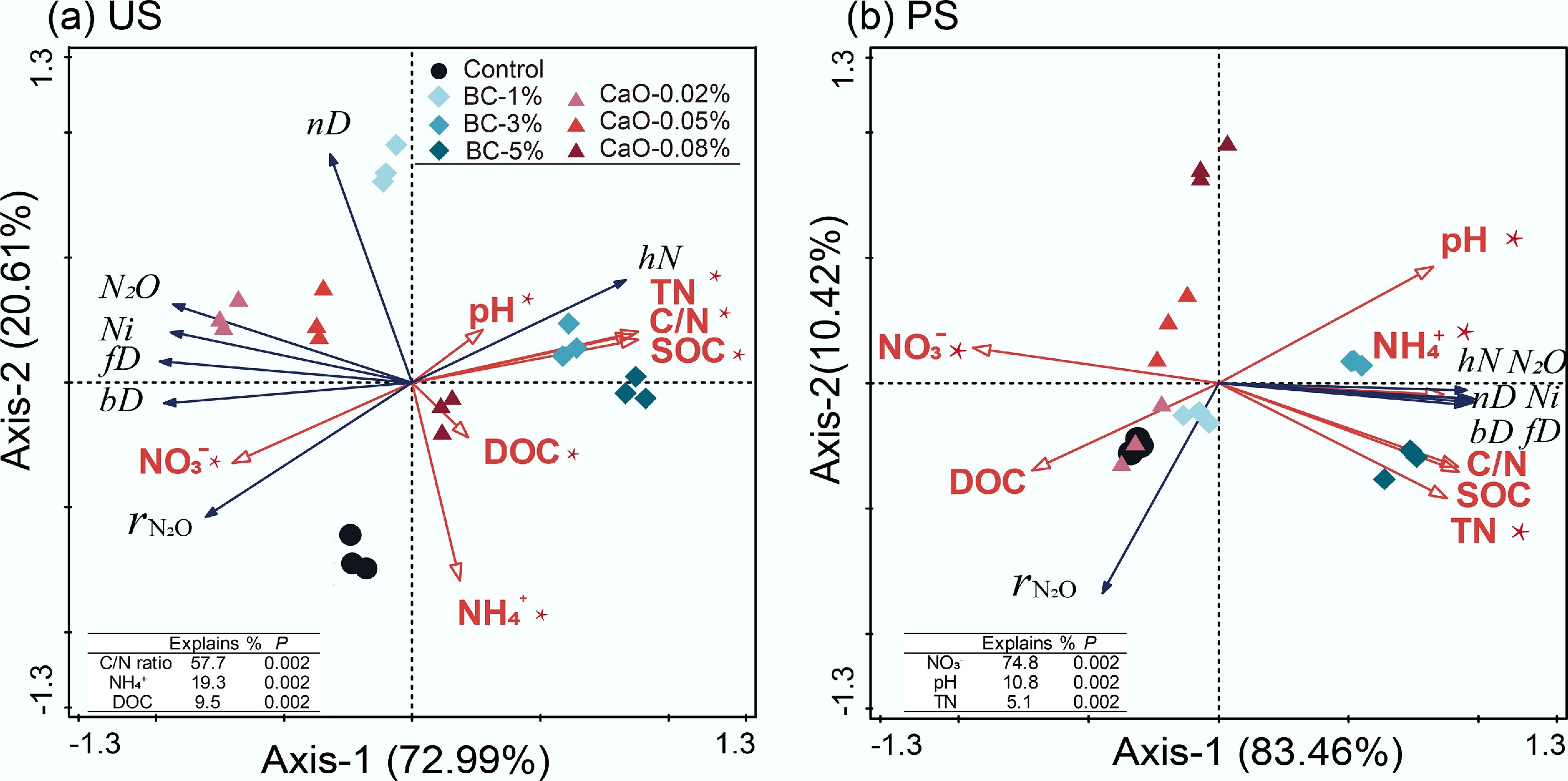 • The RDA analysis revealed a correlation between soil properties and N2O characteristics (Fig. 4). The first two ordination axes accounted for more than 90% of the total variance. In US soil, biochar treatments are clustered in the positive direction of Axis 1, indicating a close relationship with SOC, TN, and C/N ratio. The total N2O emission, that from bD and fD, and the $r_{\rm N_2O} $ ratio were positively correlated with soil NO3 concentrations, and negatively correlated with soil TN, SOC content, and C/N ratio. It indicated that BC addition potentially reduced N2O production via these denitrification pathways by increasing the C/N ratio, TN, and SOC. But CaO amendments are closely linked to elevated levels of NO3, indicating the dominance of substrate availability. In the PS, pH played a prominent role, a major driver along Axis 1. The biochar treatments were strongly associated with pH and NH4+ as well as SOC and TN. The promotion of pathway-based N2O emission is committed to the total N2O emission. With the help of SOC and TN, this promotion effect was far greater than the pH enhancement provided by CaO. The $r_{\rm N_2O} $ ratio was negatively related to soil pH, indicating that higher pH led to greater N2 emission than N2O.