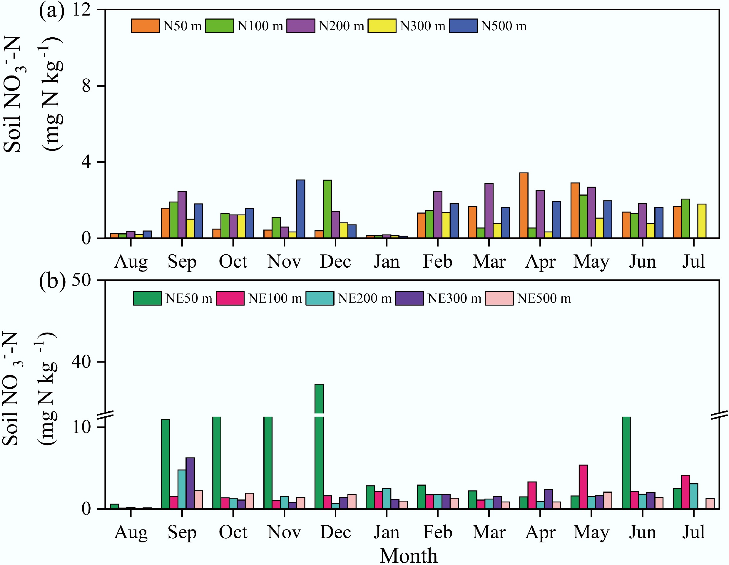 Soil NO3−-N concentrations in the N and NE transects of the pig farm from August 2018 to July 2019.