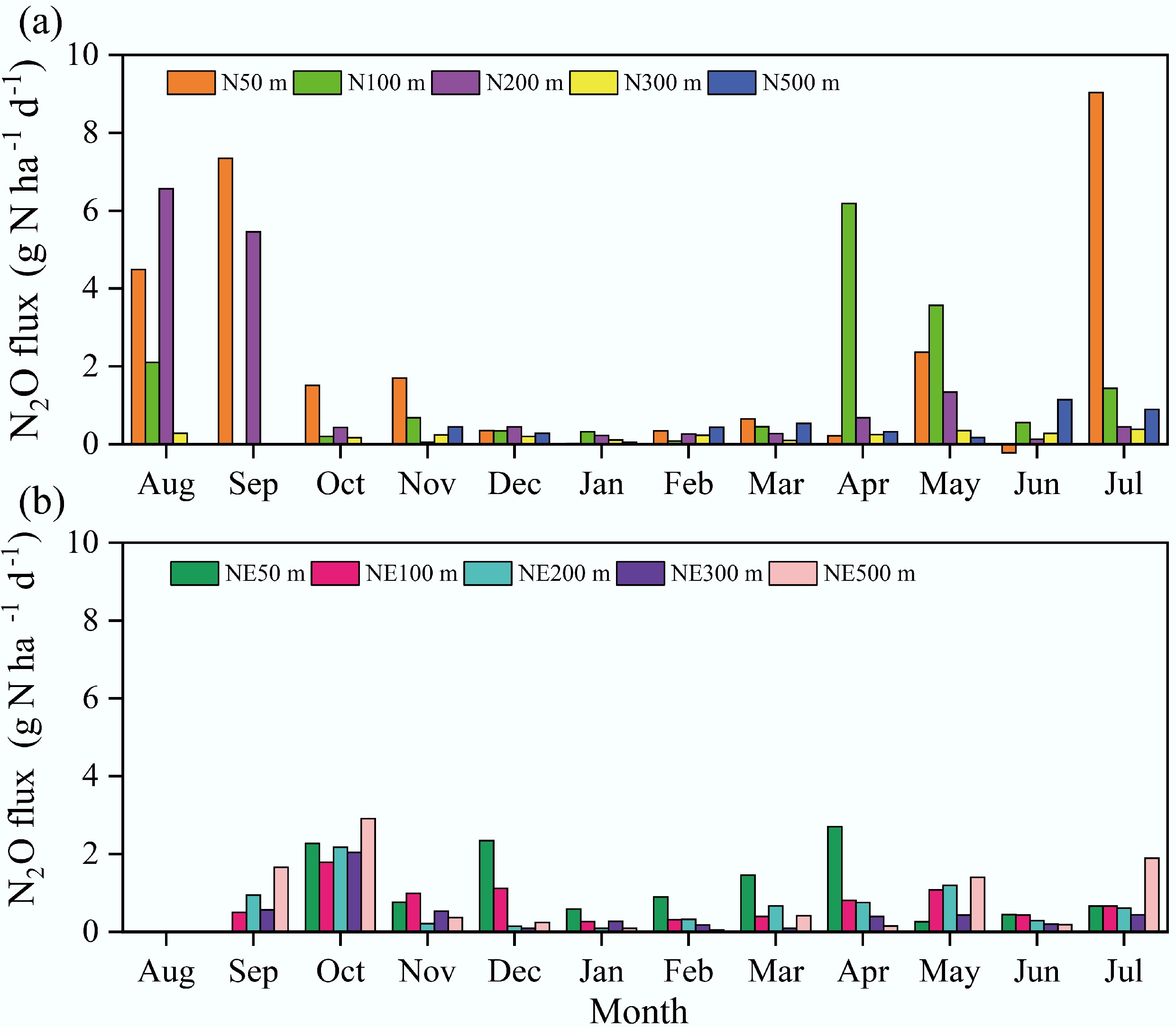In this study, soils adjacent to the pig farm predominantly served as net sources of atmospheric N2O throughout the observation period (Fig. 4). Temporally, the N transect showed single-peak dynamics, with maximum emissions occurring in August and September 2018. Conversely, the NE transect displayed bimodal variation, featuring a primary peak (September–November 2018) and a secondary peak (March–May 2019). Daily N2O flux measurements along the N transect ranged from 0 to 9.0 g N ha−1 d−1 (mean: 1.2 g N ha−1 d−1), whereas fluxes along the NE transect varied from 0 to 2.9 g N ha−1 d−1 (mean: 0.8 g N ha−1 d−1). Comparative analysis revealed consistently higher average daily fluxes along the N transect than the NE transect at all measured distances: 50 m (2.3 vs 1.1 g N ha−1 d−1), 100 m (1.3 vs 0.8 g N ha−1 d−1), 200 m (1.4 vs 0.7 g N ha−1 d−1), 300 m (0.9 vs 0.5 g N ha−1 d−1), and 500 m (1.1 vs 0.9 g N ha−1 d−1).
