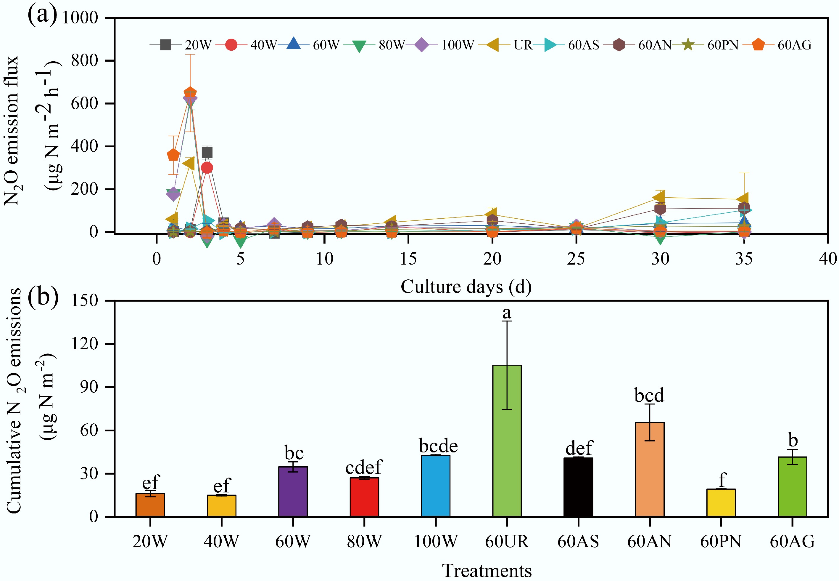 (a) Soil N2O emission fluxes under different treatments. (b) Cumulative N2O emissions under different treatments. The abbreviations in the figure denote: 20 W−20% WFPS, 40 W−40% WFPS, 60 W−60% WFPS, 80 W−80% WFPS, 100 W−100% WFPS, 60UR−60% WFPS + urea, 60AS−60% WFPS + ammonium sulfate, 60AN represents−60% WFPS + ammonium nitrate, 60PN represents–60% WFPS + potassium nitrate, and 60AG represents–60% WFPS + glucose.