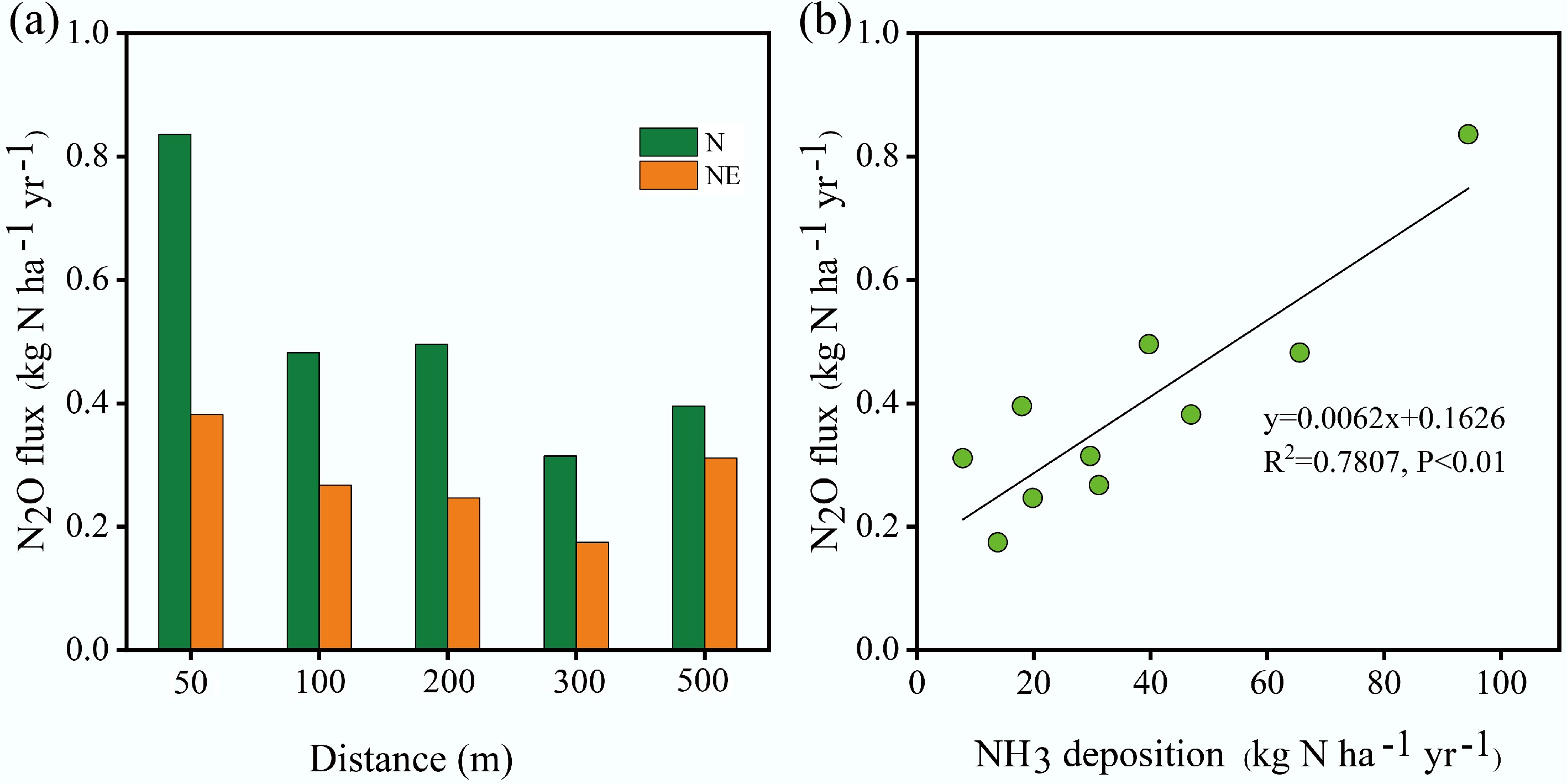 (a) N2O flux at different distances from the pig farm along the N and NE transects. (b) Relationship between NH3 deposition and N2O flux.