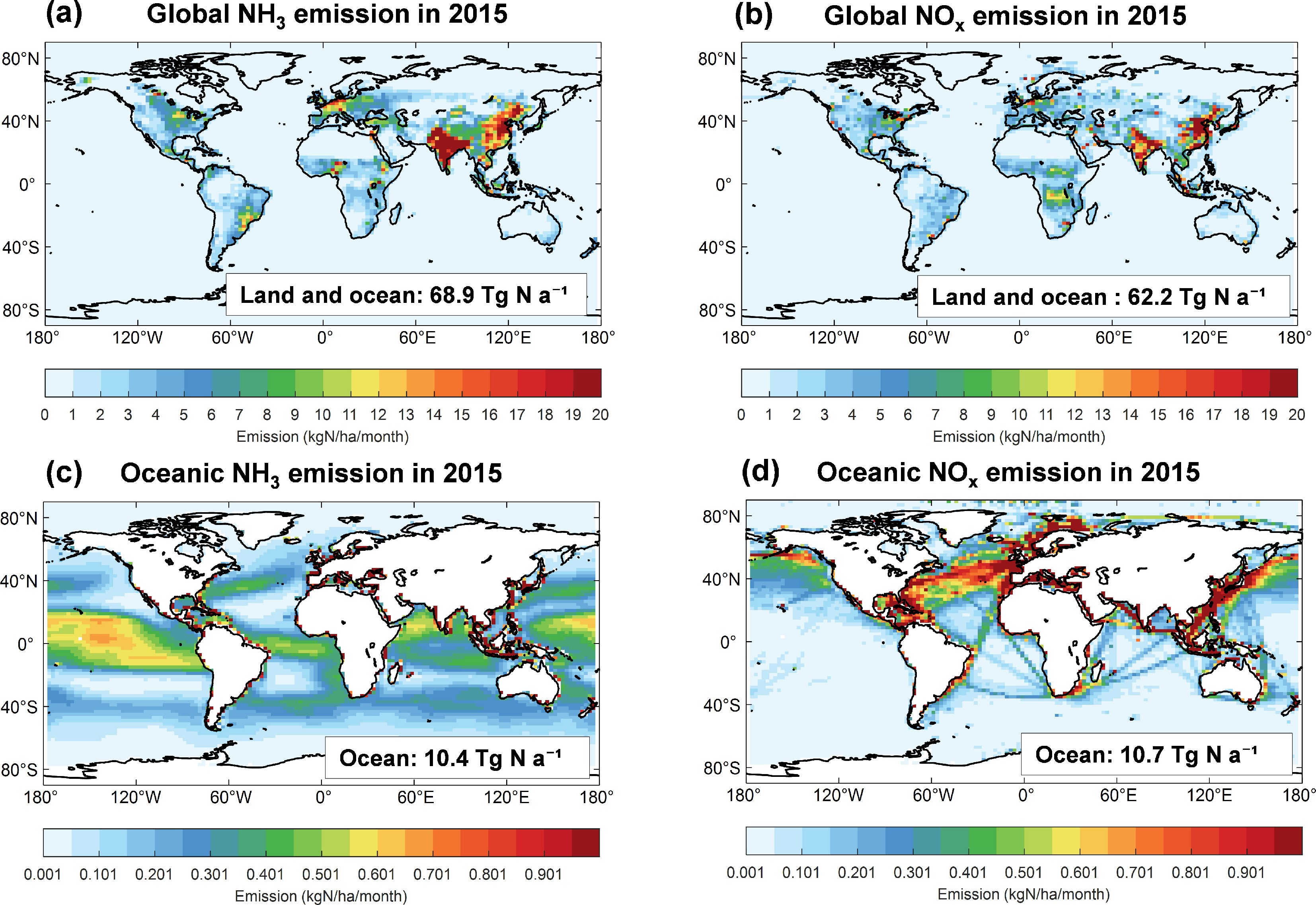 Global and oceanic reactive nitrogen emissions in 2015. (a), (b) NH3 and NOx emissions from all sources (land and ocean); (c), (d) NH3 and NOx emissions from oceanic (marine) sources only, as a subset of the global totals.