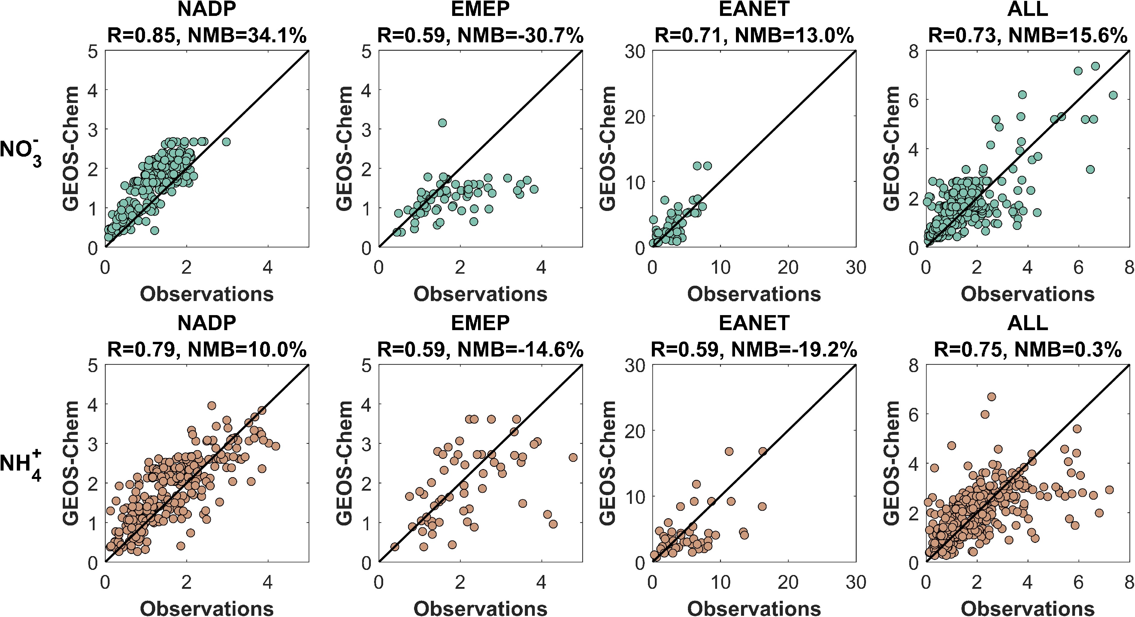 Comparisons of observed and simulated wet nitrogen deposition fluxes. The first row shows NO3 wet deposition, and the second row shows NH4+ wet deposition in units of kg N ha−1 a−1. Model results are sampled along the observational stations from the NADP, EMEP, EANET, and combined networks.