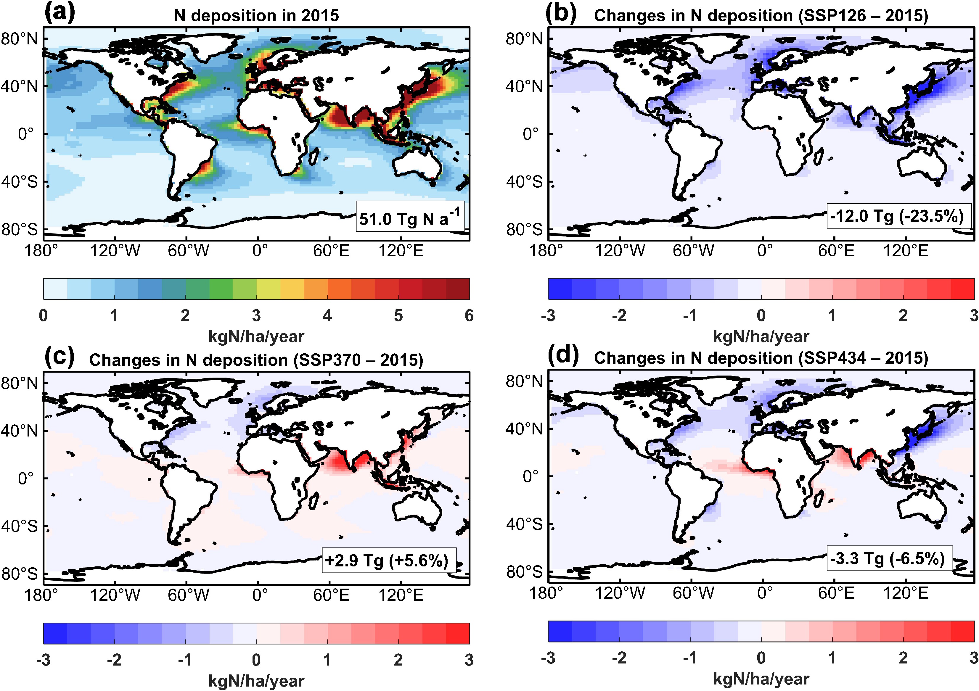 (a) Model simulated spatial distribution of oceanic nitrogen deposition in 2015 and projected changes under future 2050 emission scenarios, including (b) SSP126, (c) SSP370, and (d) SSP434. The inset values are the total global oceanic nitrogen deposition or total changes (percentage changes in parentheses) relative to the 2015 condition.