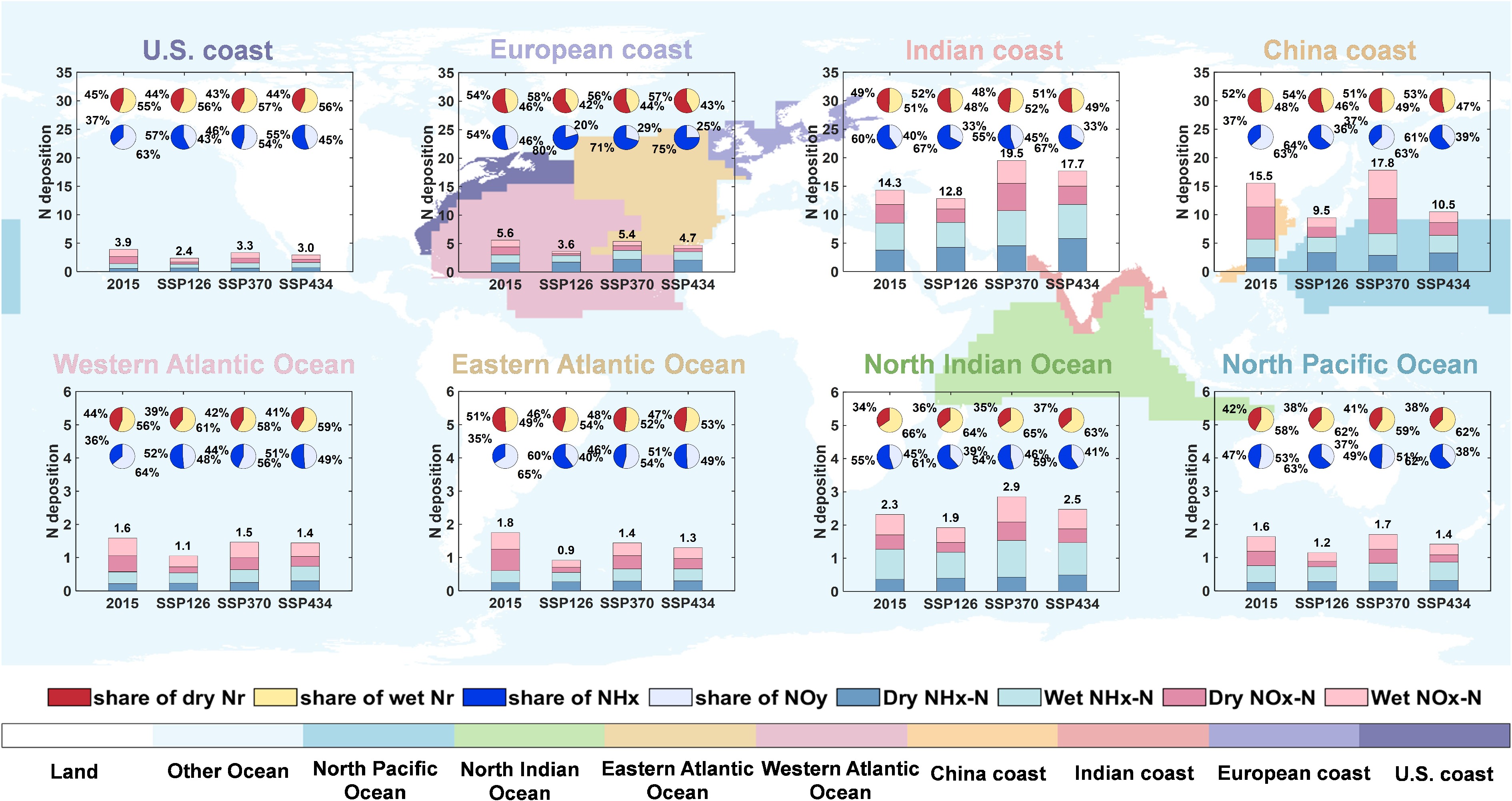 Nitrogen deposition characteristics in representative ocean regions for 2015 and three 2050 scenarios. The underlying map shows geographic locations of ocean regions (also shown in Supplementary Fig. S1) investigated, including coastal areas (1st row from left to right: US coast, European coast, Indian coast, and China coast) and open oceans (2nd row from left to right: Western Atlantic Ocean, East Atlantic Ocean, North Indian Ocean, and North Pacific Ocean). In each panel, bars represent nitrogen deposition components (dry NHx, wet NHx, dry NOy, and wet NOy deposition) for 2015 and three future emission scenarios (SSP126, SSP370, and SSP434 for 2050). Pie charts show shares of dry vs wet deposition (1st row) and NHx vs NOy deposition (2nd row). All deposition values are expressed in kg N ha−1 a−1.