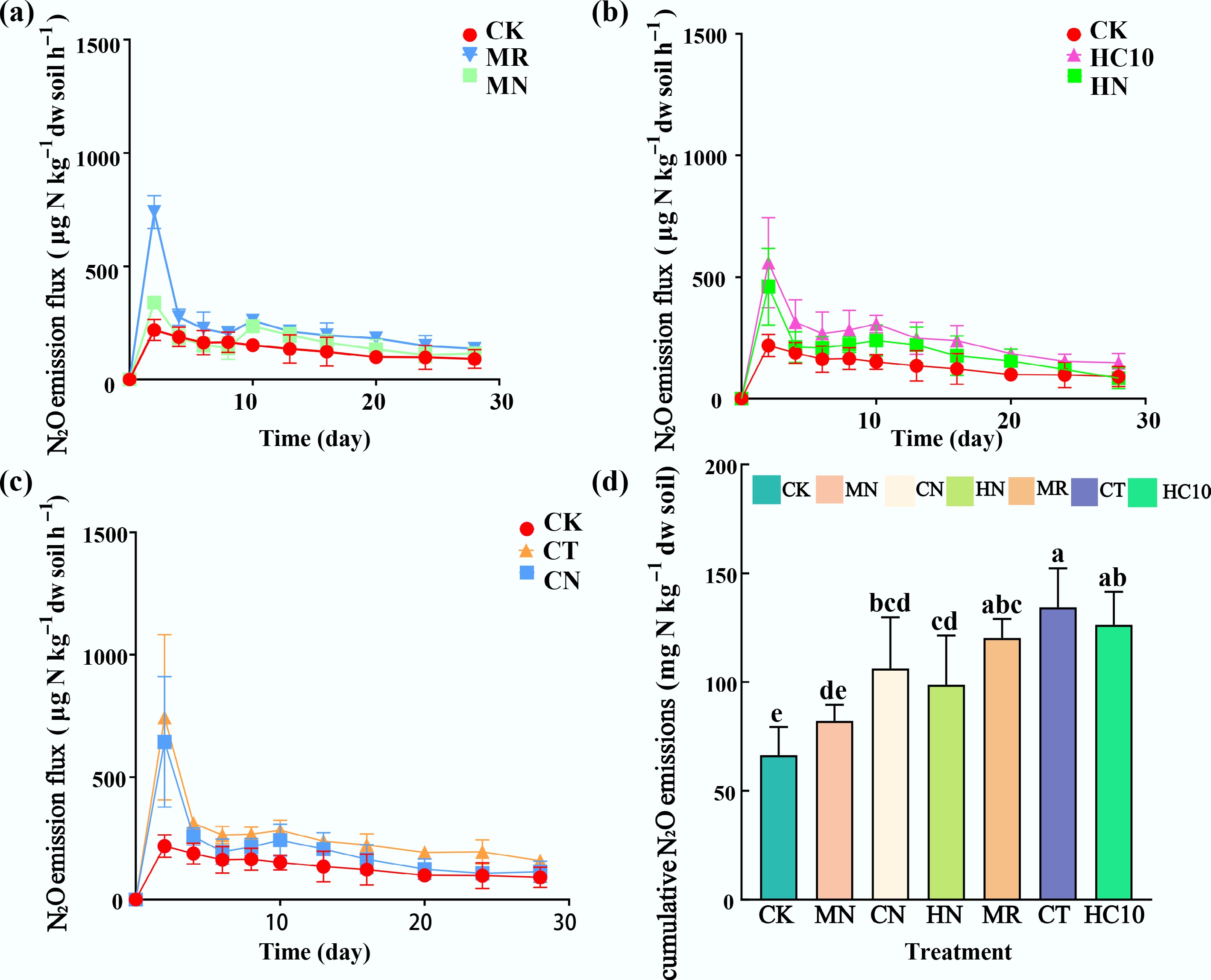 (a)–(c) N2O emission flux, and (d) cumulative emission from soil. Different small letters above the bar indicated significant differences among treatments at the 5% level. CK: no fertilizer, MR: mushroom residue organic manure, CT: high-temperature pretreated compost, HC10: hydrothermal carbonized organic manure, MN: mushroom residue organic manure with NRCB010, CN: high-temperature pretreated compost with NRCB010, HN: hydrothermal carbonized organic manure with NRCB010.