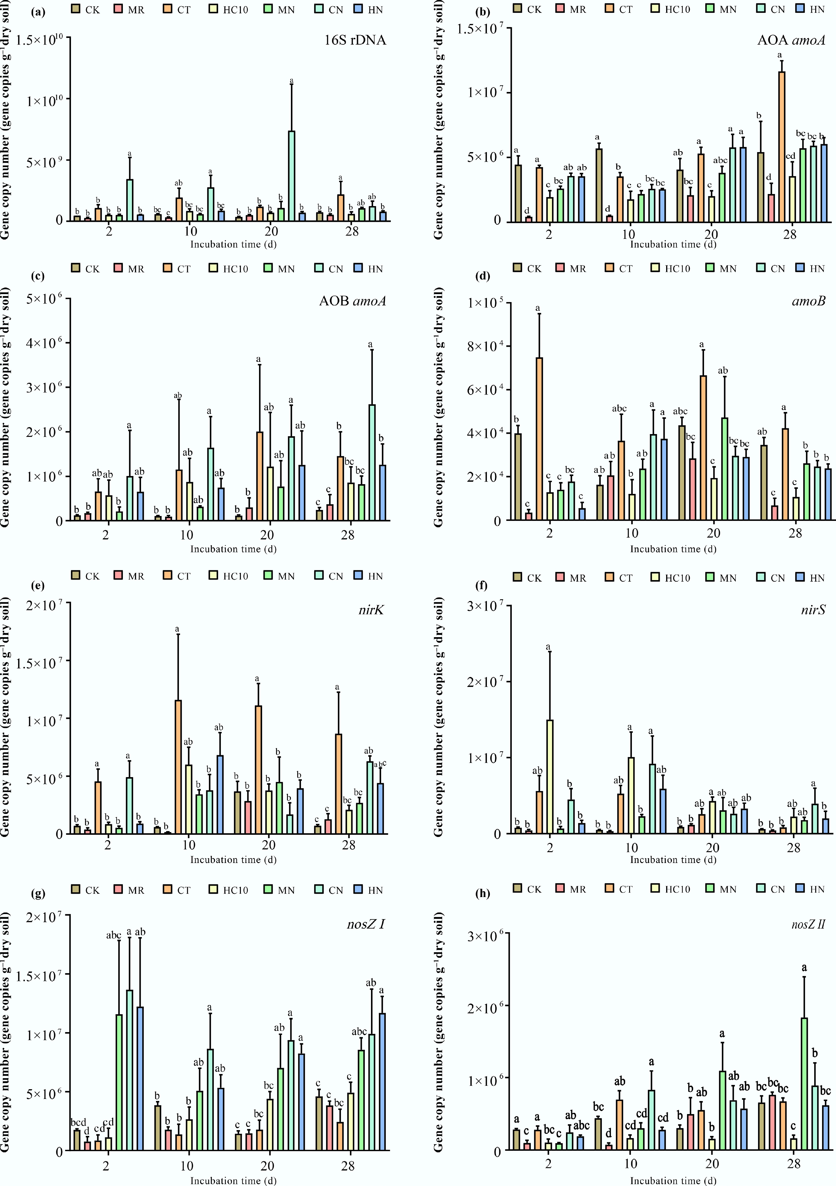 Abundance of nitrogen cycling functional genes in soils. (a) The abundance of 16S rDNA in soils. (b) The abundance of AOA amoA genes in soils. (c) The abundance of AOB amoA genes in soils. (d) The abundance of amoB genes in soils. (e) The abundance of nirS genes in soils. (f) The abundance of f nirK genes in soils. (g) The abundance of nosZI genes in soils. (h) The abundance of nosZII genes in soils. Different lowercase letters above the bar indicated significant differences among treatments at the 5% level. CK: no fertilizer, MR: mushroom residue organic manure, CT: high-temperature pretreated compost, HC10: hydrothermal carbonized organic manure, MN: mushroom residue organic manure with NRCB010, CN: high-temperature pretreated compost with NRCB010, HN: hydrothermal carbonized organic manure with NRCB010.