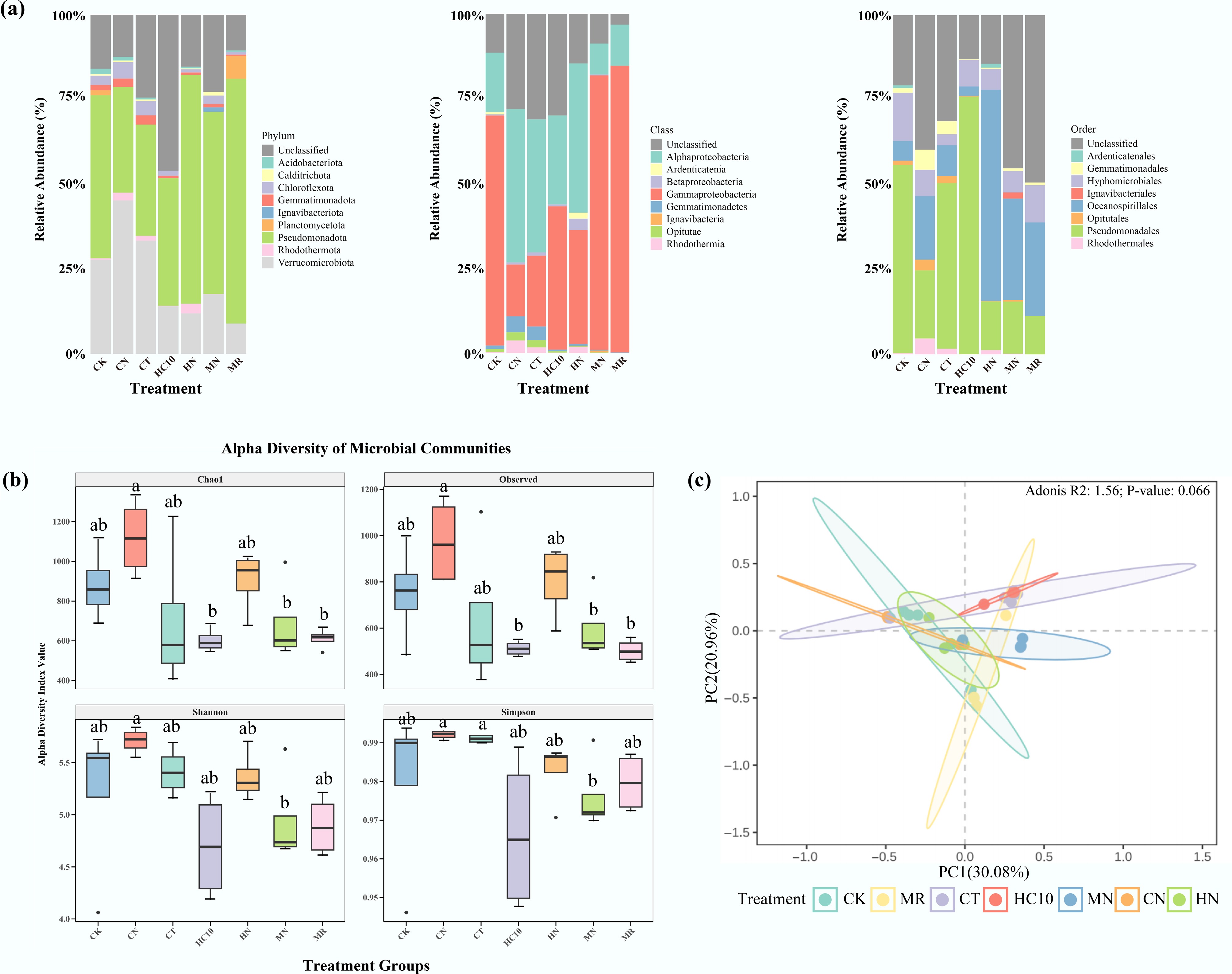 • Neutral community modeling[27] analysis revealed that the CT and HC10 treatments exhibited the highest R2 values, followed by the MR and MN treatments (Fig. 4a). The community structures under these four treatments showed a better fit with the neutral model, and stochastic processes had greater explanatory power for community assembly. The low R2 values of the CK, CN, and HN treatments indicate that deterministic processes play a more important role. In the CK treatment, the absence of organic fertilizer leads to reduced soil nutrient availability and intense environmental filtering. In the CN and HN treatments, NRCB010 colonization alters soil pH, EC, and carbon-nitrogen supply, thereby reshaping the community structure through interspecific competition and synergistic interactions. The high R2 values of the CT and HC10 treatments suggest that stochastic processes dominate community assembly, which may be related to the weak selective pressure of these two organic fertilizers on microorganisms due to their physicochemical properties—such as the low C/N ratio of CT and the high carbon content of HC10. The MR and MN treatments had the highest Nm values, suggesting that inter-community species migration and diffusion capacities were strongest under these treatments, with higher species exchange frequency and a more uniform species distribution. A synergistic analysis showed that stochastic processes dominated the community assembly in the CT and HC10 treatments, with moderate species diffusion capacity; in the MR and MN treatments, stochastic processes mainly shaped the communities. Although species diffusion capacity was relatively strong in the CK, CN, and HN treatments, deterministic processes remained a key regulator of the community structure.