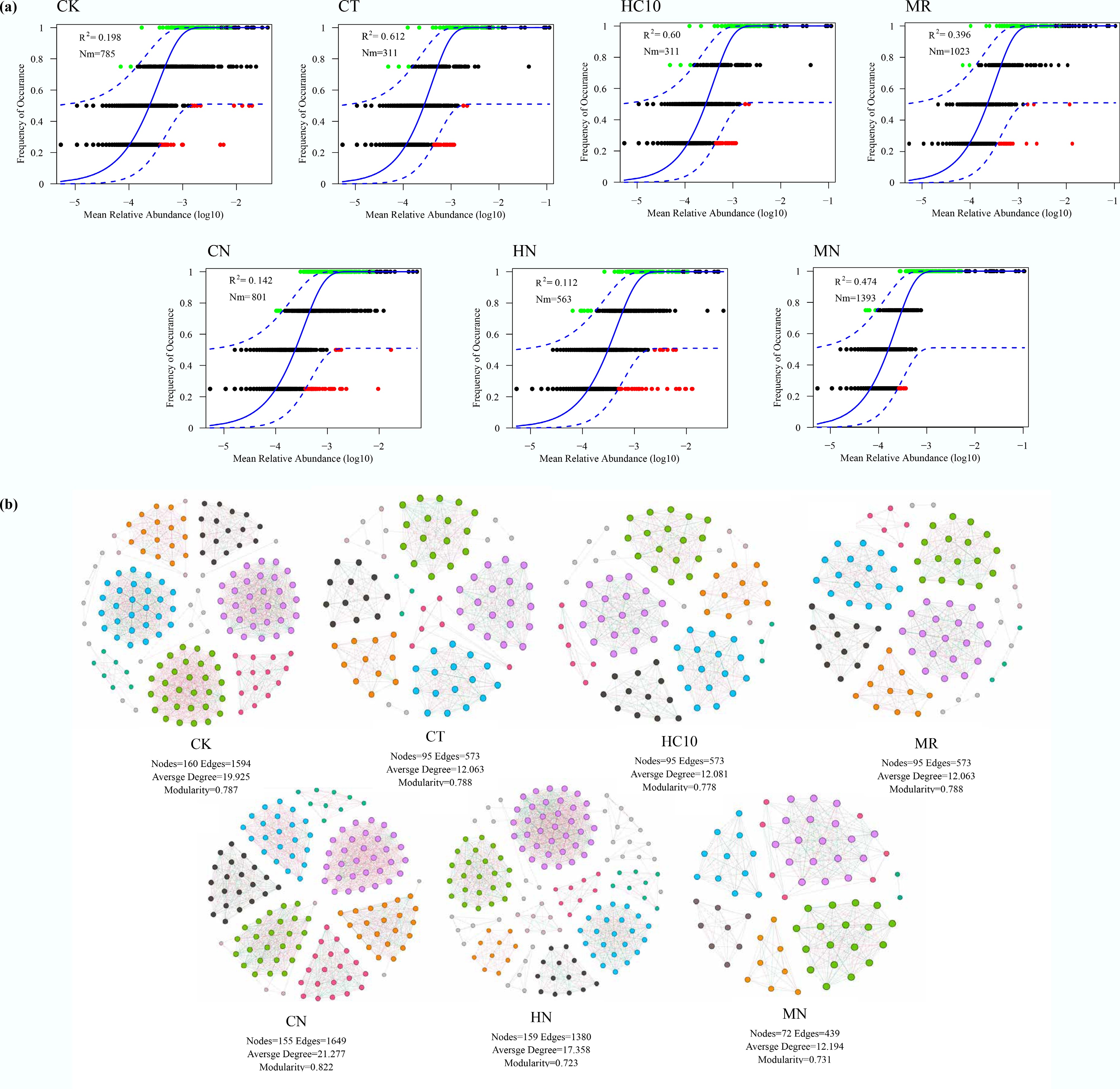 The community assembly based on (a) neutral theory, and (b) co-occurrence network of nosZI carrying microorganisms. R2 indicates the model fit, and Nm represents the product of metacommunity size and migration time. CK: no fertilizer, MR: mushroom residue organic manure, CT: high-temperature pretreated compost, HC10: hydrothermal carbonized organic manure, MN: mushroom residue organic manure with NRCB010, CN: high-temperature pretreated compost with NRCB010, HN: hydrothermal carbonized organic manure with NRCB010.