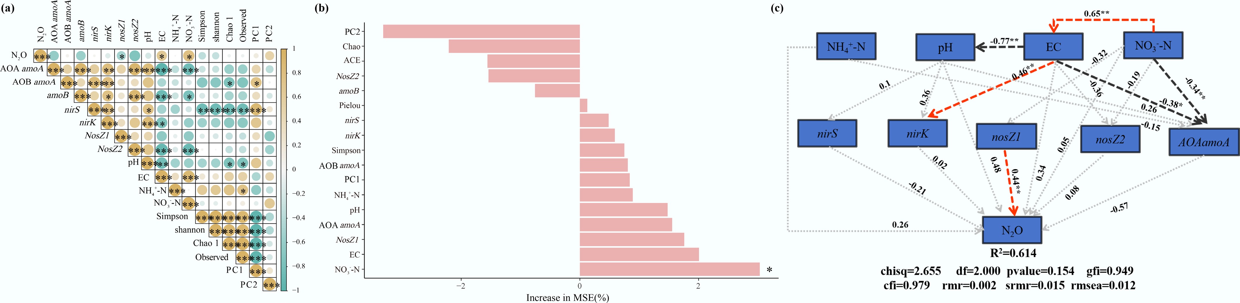 (a) Correlation analysis, (b) random forest model, and (c) structural equation model analyses of environmental factors and N2O emissions from greenhouse vegetable soils. The red arrows and black arrows show positive and negative relationships, respectively. The numbers above the lines are standardized path coefficients. The width of the arrows is proportional to the strength of the path coefficients. * Significance at the p < 0.05 level, ** significance at the p < 0.01 level, and *** significance at the p < 0.001 level.