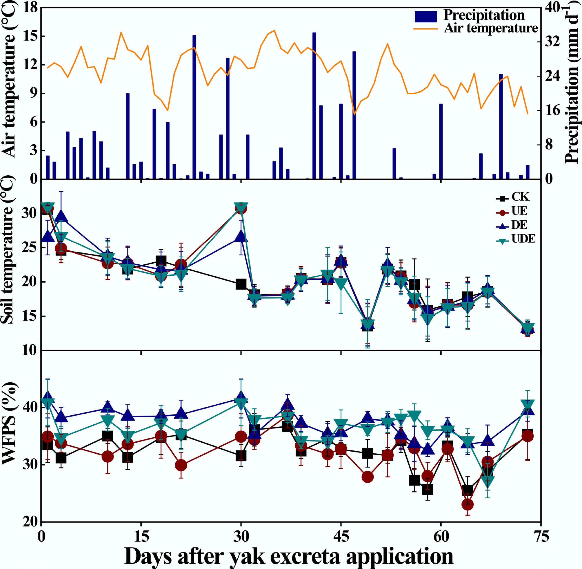 Variation in daily air temperature and precipitation, and the effects of urine and dung excreta application on soil temperature at 5 cm depth and water-filled pore space (WFPS) from July 2, 2020 to September 12, 2020. CK, without excretion application; UA, urine application; DA, dung application; UDA, combined urine and dung application. The error bars represent the standard errors of the mean (n = 4).