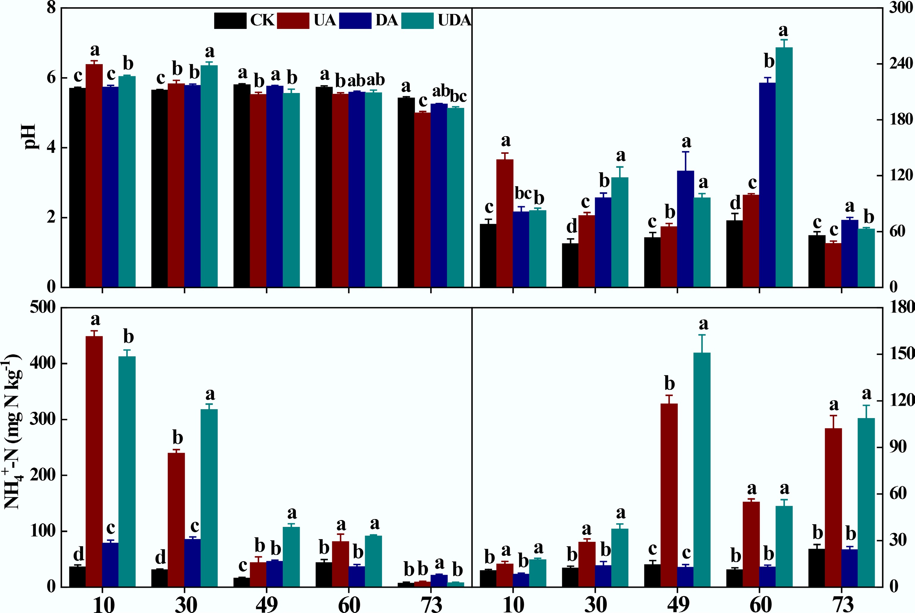 Excreta application significantly affected soil pH, DOC, and inorganic N concentrations (Fig. 2). Soil pH was significantly higher in the UA treatment than in the DE treatment on day 10. Still, this pattern reversed on days 49 and 73. On day 30, soil pH in the UDA treatment significantly exceeded that in both the UA and DA treatments (Fig. 2). Soil DOC concentration in the UA treatment was significantly higher than that in the DA treatment on all sampling days except for day 10. It was significantly higher in the UDA treatment relative to the UA and DA treatments on days 30 and 60 (Fig. 2). On days 10, 30, and 60, soil NH4+-N concentration was significantly higher in the UE treatment than in the DA treatment. Furthermore, the UDA treatment exhibited significantly higher NH4+-N concentrations than the UA and DA treatments on days 30 and 49 (Fig. 2). Throughout the experiment, soil NO3−-N concentrations in both the UA and UDA treatments were significantly higher than those in the DA treatment (Fig. 2).