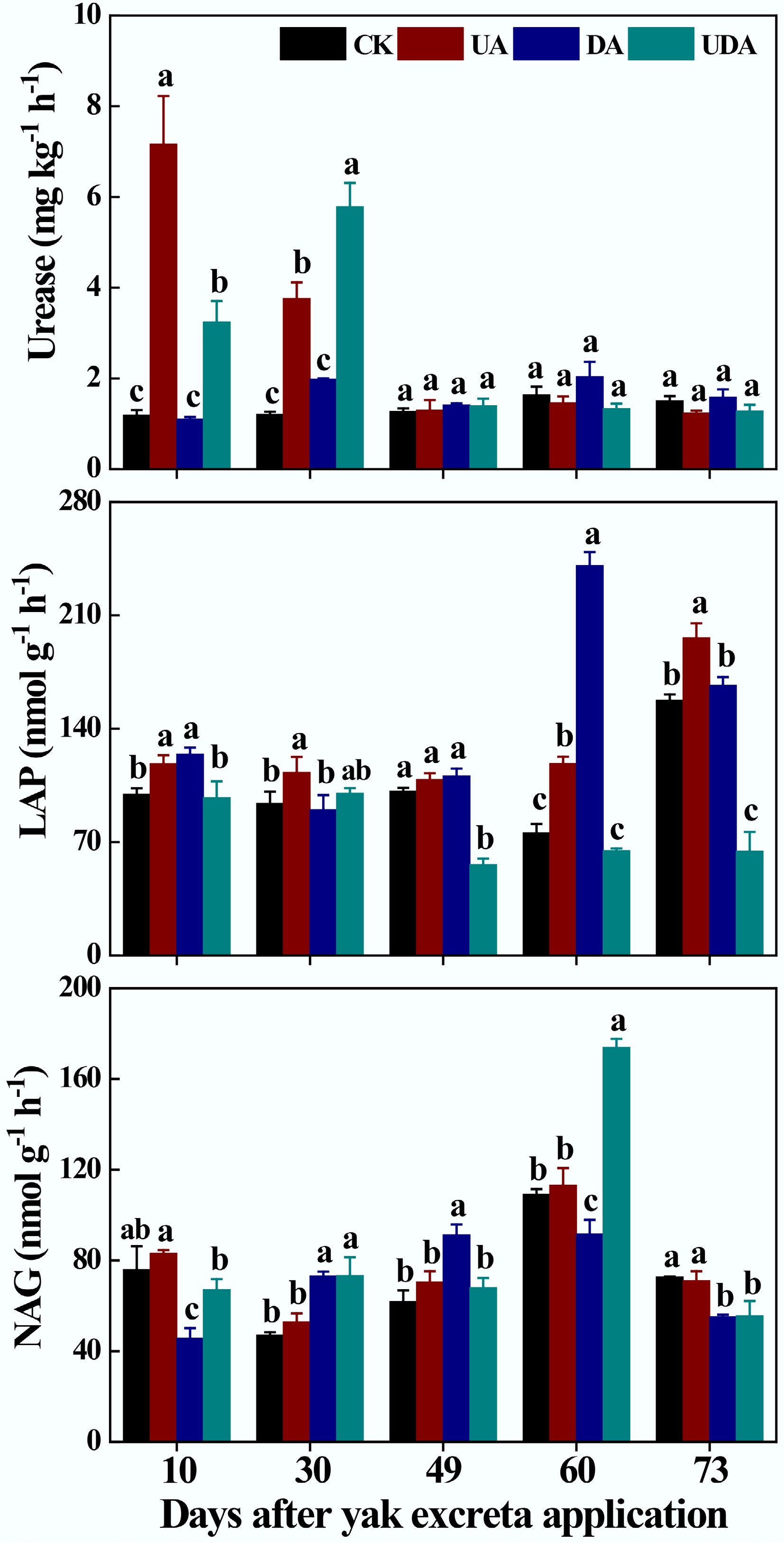 Soil Urease, LAP and NAG under different yak excreta application treatments. CK, without excretion application; UA, urine application; DA, dung application; UDA, combined urine and dung application; LAP, leucine aminopeptidase; NAG, β-N-acetylglucosaminidase. The error bars represent the standard errors of the mean (n = 4). The lowercase letters indicate significant differences among treatments at the same sampling time (p < 0.05).