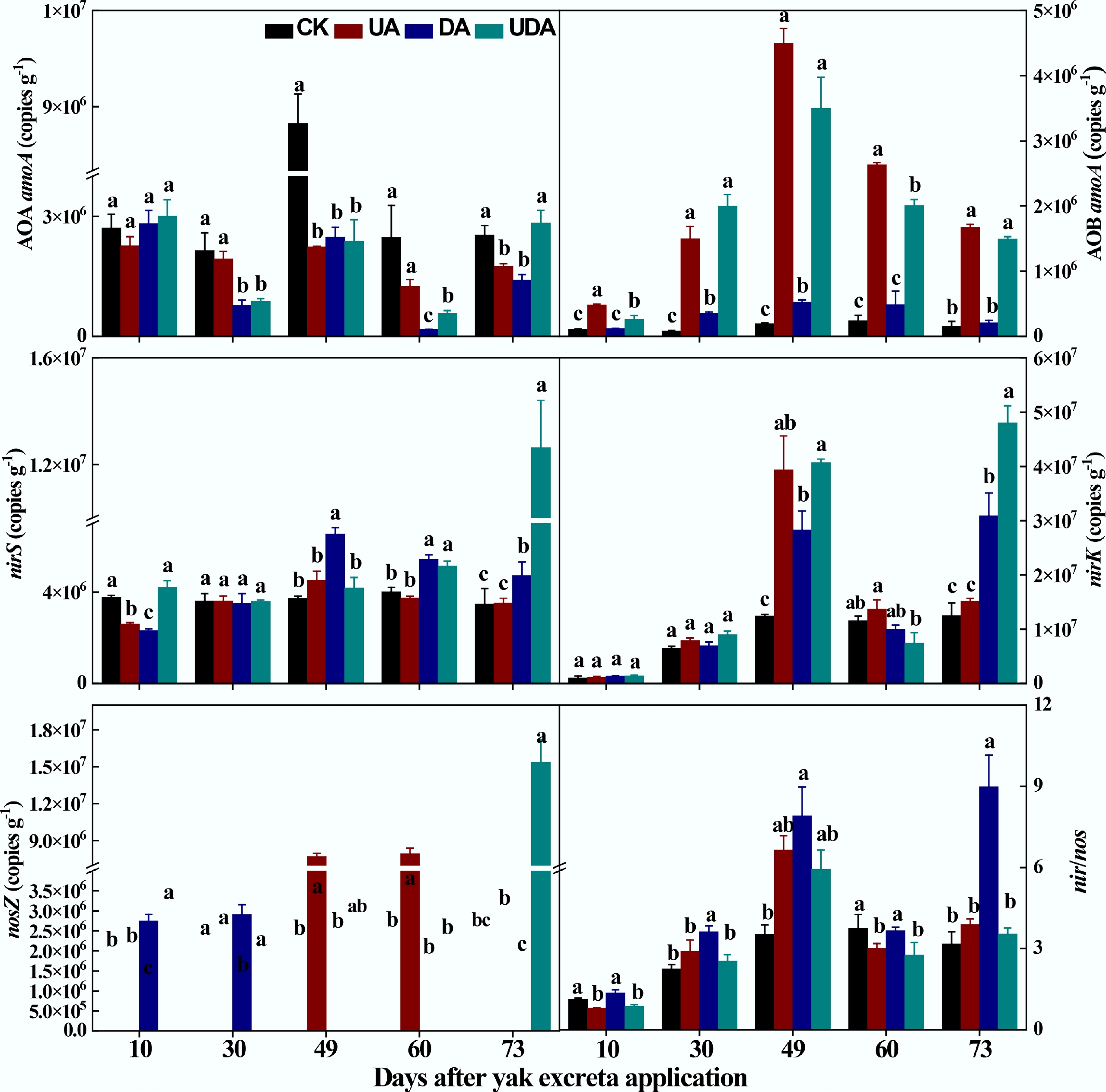 The abundances of nitrifying functional gene (AOA amoA and AOB amoA), denitrifying functional gene (nirS, nirK and nosZ) and nir/nos under different yak excreta application treatments. CK, without excretion application; UA, urine application; DA, dung application; UDA, combined urine and dung application. The error bars represent the standard errors of the mean (n = 4). The lowercase letters indicate significant differences among treatments at the same sampling time (p < 0.05).