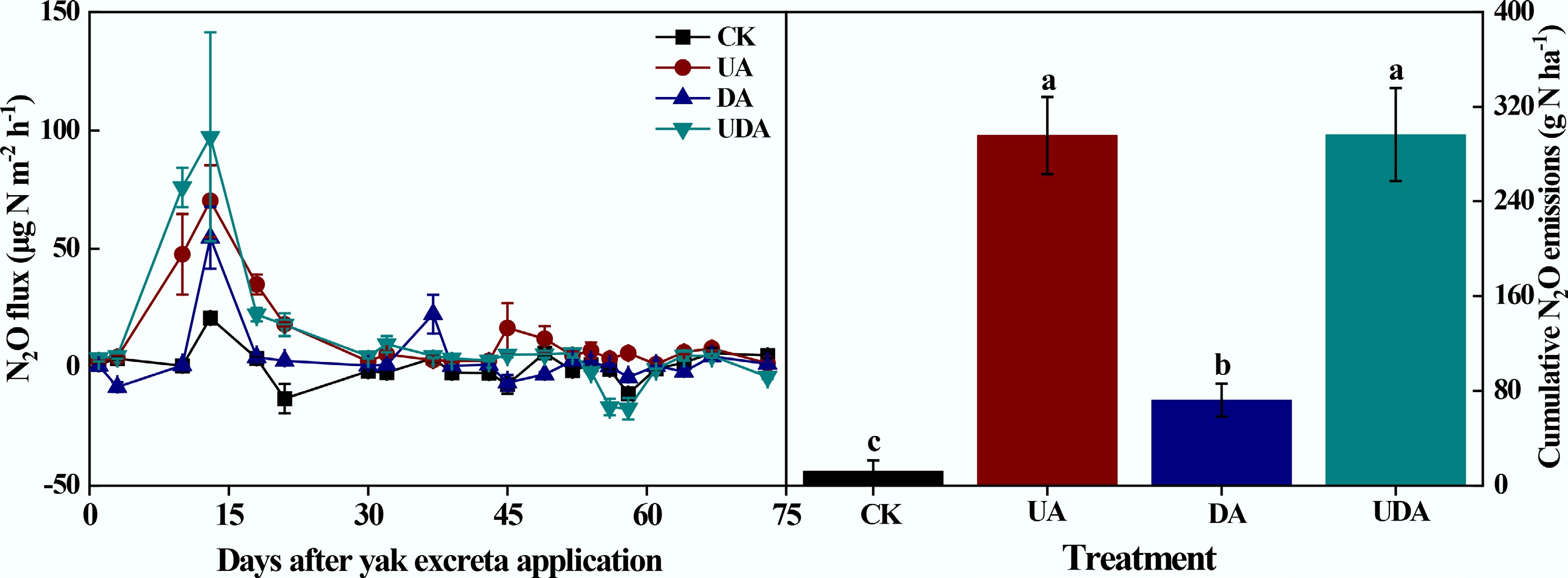 Soil N2O fluxes and cumulative N2O emission under different yak excreta application treatments. CK, without excretion application; UA, urine application; DA, dung application; UDA, combined urine and dung application. The error bars represent the standard errors of the mean (n = 4). Different letters indicate significant differences between different treatments (p < 0.05).