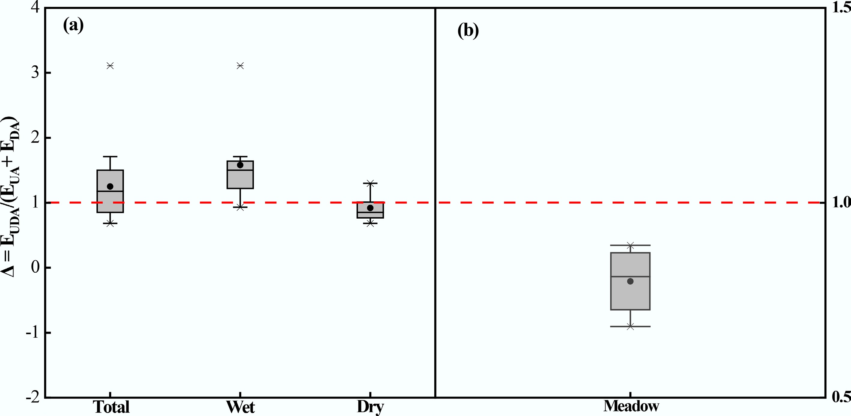 Proportional change (Δ) in cumulative N2O emissions from the UDA treatment compared to the theoretical sum UA and DA of the individual treatments. UA, urine application; DA, dung application; UDA, combined urine and dung application; EUDA, cumulative N2O emissions from the UDA treatment; EUA + EDA, the theoretical sum of cumulative N2O emissions from the separate UA and DA treatments. The data set was compiled from (a) all studies (n = 18), including14 from previously published studies, and (b) 4 from the present study. If the relation is Δ = 1, then the effect of combining urine and dung on N2O emissions is additive. If Δ > 1, combining urine and dung results in a synergistic effect on N2O production, exceeding the sum of the individual emissions. Conversely, the Δ < 1, indicating that the effect of combining urine and dung excreta application on soil N2O emissions is antagonistic.