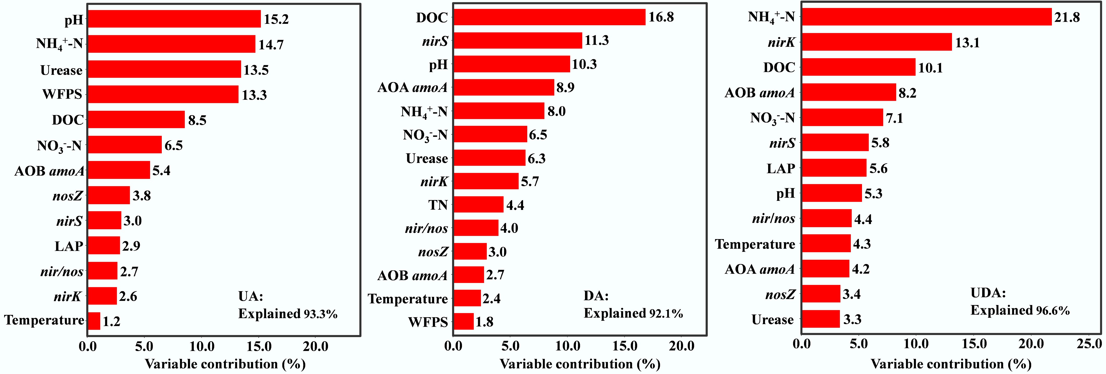 Relative importance of soil properties on soil N2O emissions under different yak excreta application treatments. UA, urine application; DA, dung application; UDA, combined urine and dung application. N2O, soil N2O emissions; WFPS, water-filled pore space; DOC, dissolved organic carbon; NH4+-N, ammonium nitrogen; NO3−-N, nitrate nitrogen; NAG, β-N-acetylglucosaminidase activities; LAP, leucine aminopeptidase activities; nosZ, nosZ I gene abundance.