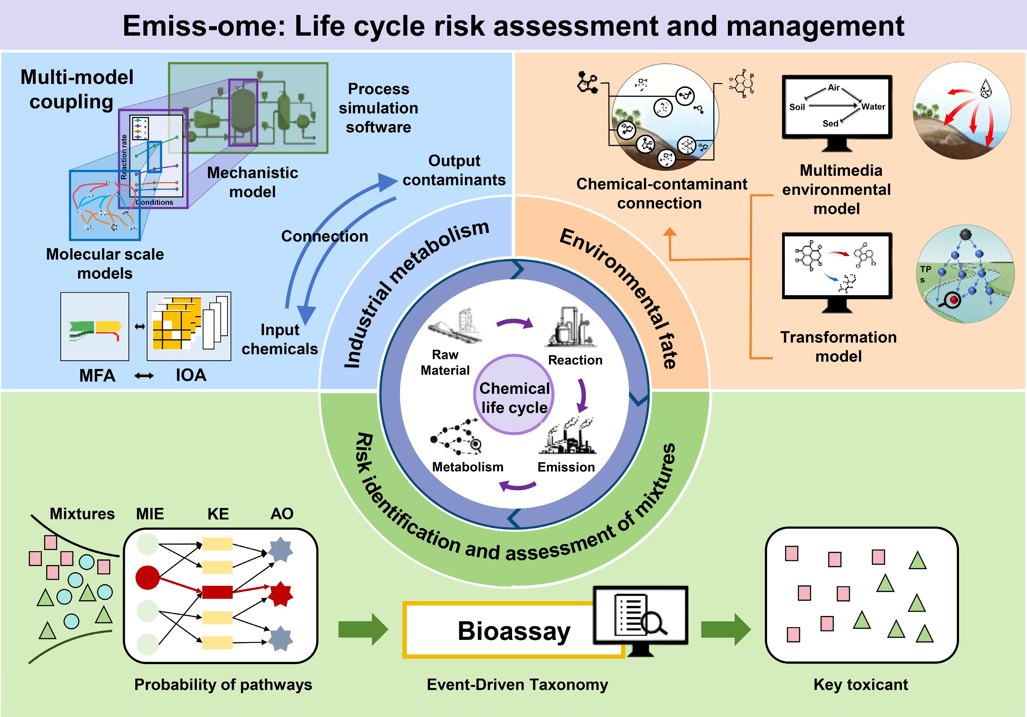 Abstract: Industrial chemicals are released throughout their life cycle (from upstream production to downstream emission), causing pervasive pollution of new contaminants and posing substantial risks to ecosystems and human health. The complex transfer and transformation of these chemicals during industrial and environmental processes necessitate dynamic risk assessment approaches. However, current methodologies remain predominantly static and endpoint-oriented, emphasizing instantaneous risks after emission while overlooking pollutant formation dynamics across the chemical life cycle, particularly for chemicals with transformation potentials. This disconnection impedes effective contaminant source tracing, identification of high-risk mixture components, and evaluation of cumulative life cycle risks. Based on the concept of emiss-ome, we attempt to establish mechanistic linkages between industrial chemicals, and end-of-life pollutants. We demonstrate how industrial metabolism analysis, coupled with environmental fate and transport models, elucidates material flows across the chemical life cycle, establishing quantitative source-pollutant relationships. To identify key contaminants and address mixture toxicity, the application of adverse outcome pathway frameworks are examined to reveal dominant toxicity pathways, enabling identification of key toxicants, and risk evaluation of chemical mixtures. Ultimately, the integration of chemical metabolism and risk flow is expected to establish a novel framework to trace key toxicants back to their source chemicals and assess cumulative life cycle risks, facilitating a paradigm shift from terminal risk identification toward proactive life cycle risk assessment and management.