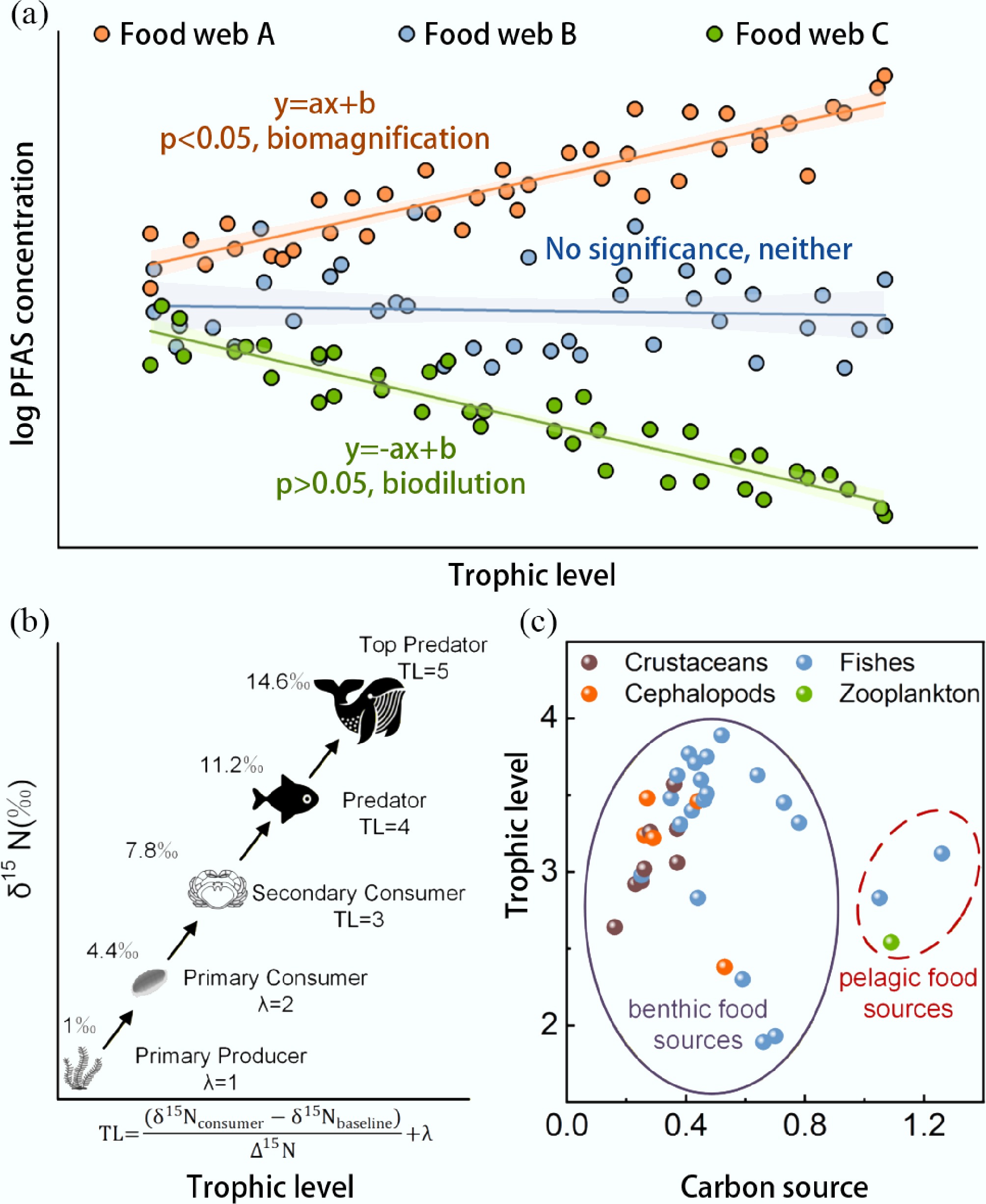 Pan et al. studied the biomagnification of PFAS in a subtropical marine food web, emphasizing the importance of establishing a well-defined food web structure for TMF calculations. They initially found that all species had similar δ13C values, indicating a shared carbon source base among these organisms. To further verify whether these species belonged to the same continuous food chain, they calculated the relative carbon source proportions and ultimately constructed a clear food web structure, except for phytoplankton and Grammoplites scaber. This food web structure served as the basis for the subsequent TMF calculations[61]. In contrast, Fang et al. identified several species with similar carbon sources but did not specify the structure of the food web. In their subsequent analyses, the subjective choice of whether to include invertebrates yielded two distinct TMF results[62]. The comparison above demonstrates that a clear and reasonable food web structure is a prerequisite for ensuring the reliability of TMF assessment results[29,60].