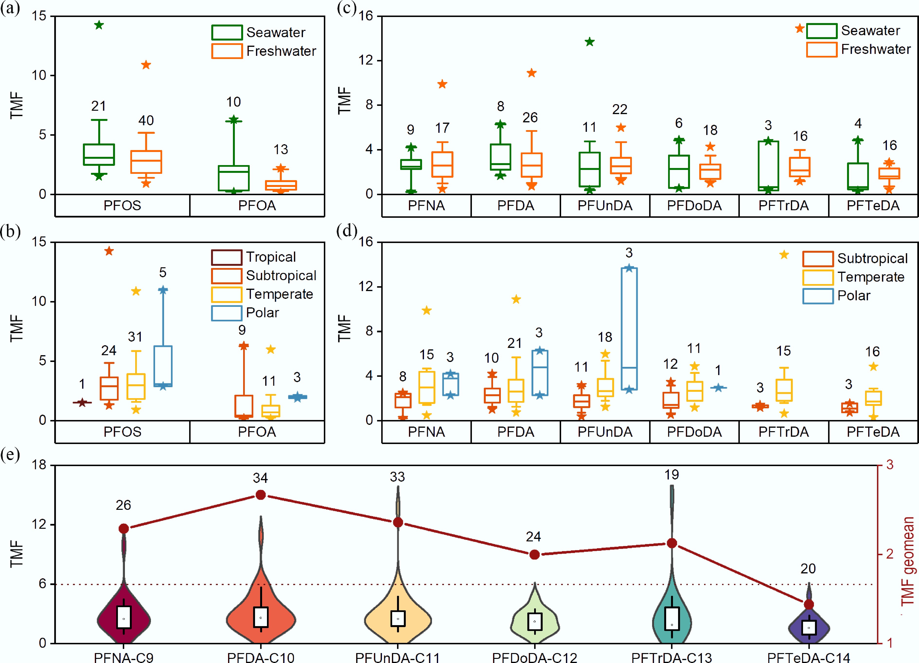 A multitude of studies have demonstrated that long-chain PFCAs generally exhibit a biomagnification potential. In the Lake Ontario food web, Ren et al. calculated TMFs of 2.6, 3.7, 3.1, 2.7, 2.7, and 2.7 for PFNA, PFDA, PFUnDA, PFDoDA, PFTrDA, and PFTeDA, respectively, all of which exceeded 1[83]. Similarly, Tomy et al. reported TMFs of 3.8, 6.3, and 13.7 for PFNA, PFDA, and PFUnDA, respectively, in the western Canadian Arctic marine food web based on marine mammal and mesopelagic fish liver samples[84]. Conversely, some studies have observed biodilution of long-chain PFCAs. For example, Pan et al. reported TMFs of 0.2455, 0.7499, 0.5741, and 0.7586 for PFNA, PFUnDA, PFDoDA, and PFTeDA, respectively, in the subtropical Beibu Gulf marine food web of southern China[61]. The TMF of long-chain PFCAs did not exhibit a pattern similar to that of PFOS and PFOA in seawater or freshwater (Fig. 3c).