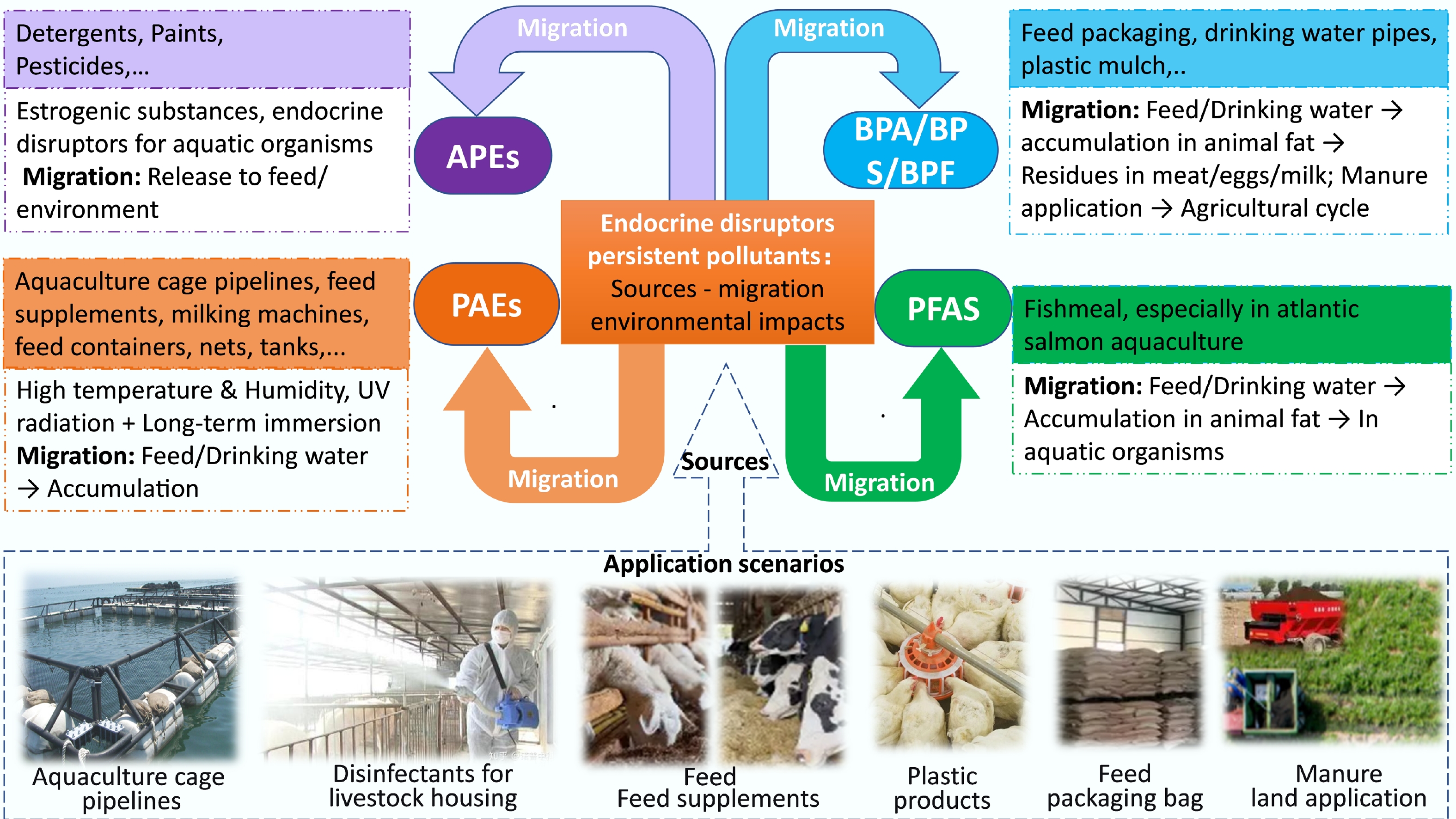 In aquaculture and livestock farming systems, EDCs enter the waste stream through multiple pathways, including feed additives, plastic equipment, water systems, disinfectants, and manure application, ultimately accumulating in water, soil, and biota (Fig. 2)[19−24].