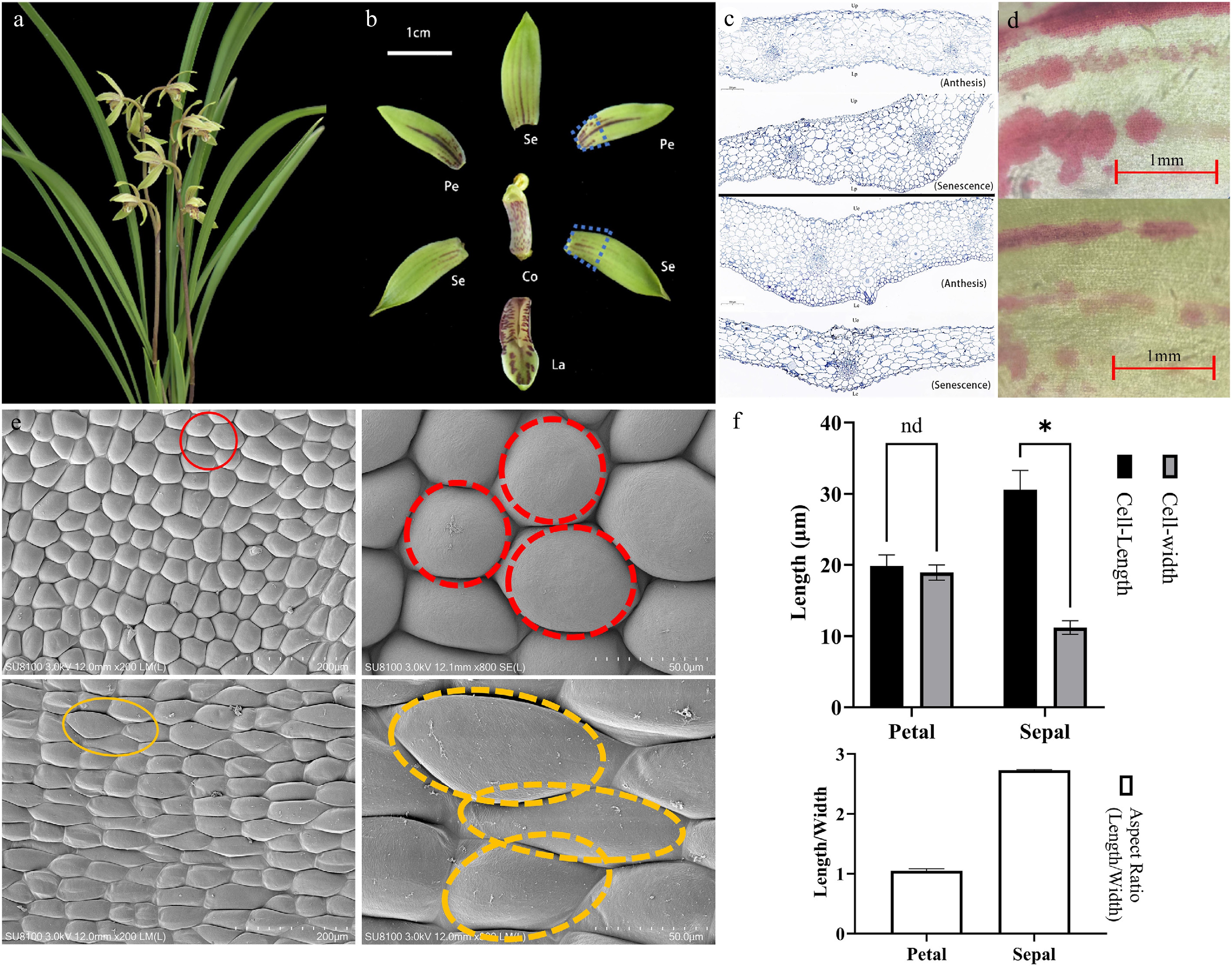 Microscopic observations of floral structures during the full bloom period of C. ensifolium. (a) Fully bloomed flowers. (b) Characteristics of different floral parts. Se, sepal; Pe, petal; La, labellum; Co, column. (c) Longitudinal structural diagram of petals and sepals. (d) Pigment distribution on the epidermis of sepals and petals at anthesis and senescence stages, visualized by light microscopy. (e) Scanning electron microscopy (SEM) images of petal and sepal epidermal cells. The red and yellow circles indicate typical polygonal cells and elongated cells, respectively. (f) Quantitative analysis of cell size in petal and sepal epidermis. Asterisks indicate statistically significant differences (*, p < 0.0001).