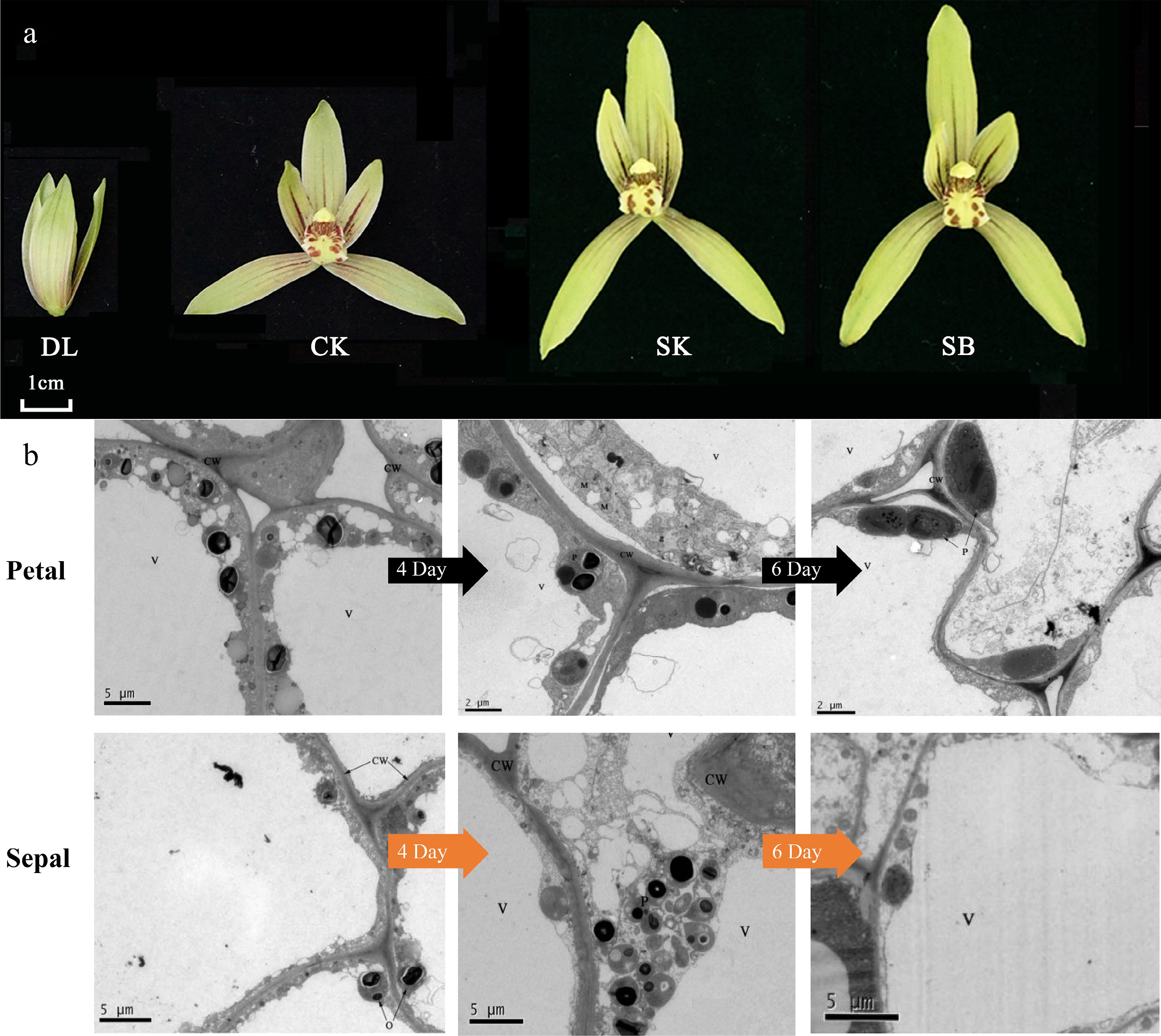 Developmental stages and ultrastructural characteristics of floral epidermal cells in C. ensifolium. (a) The nine blooming stages of C. ensifolium. DL (bud stage), CK (initial blooming, day 0), SK (full bloom, day 4), and SB (senescence stage, day 10). (b) Ultrastructural features of sepal and petal epidermal cells at different flowering stages. 4D and 6D refer to flowers that have been open for 4 d and 6 d, respectively. CW: cell wall; V: vacuole; P: plastid; M: mitochondrion.