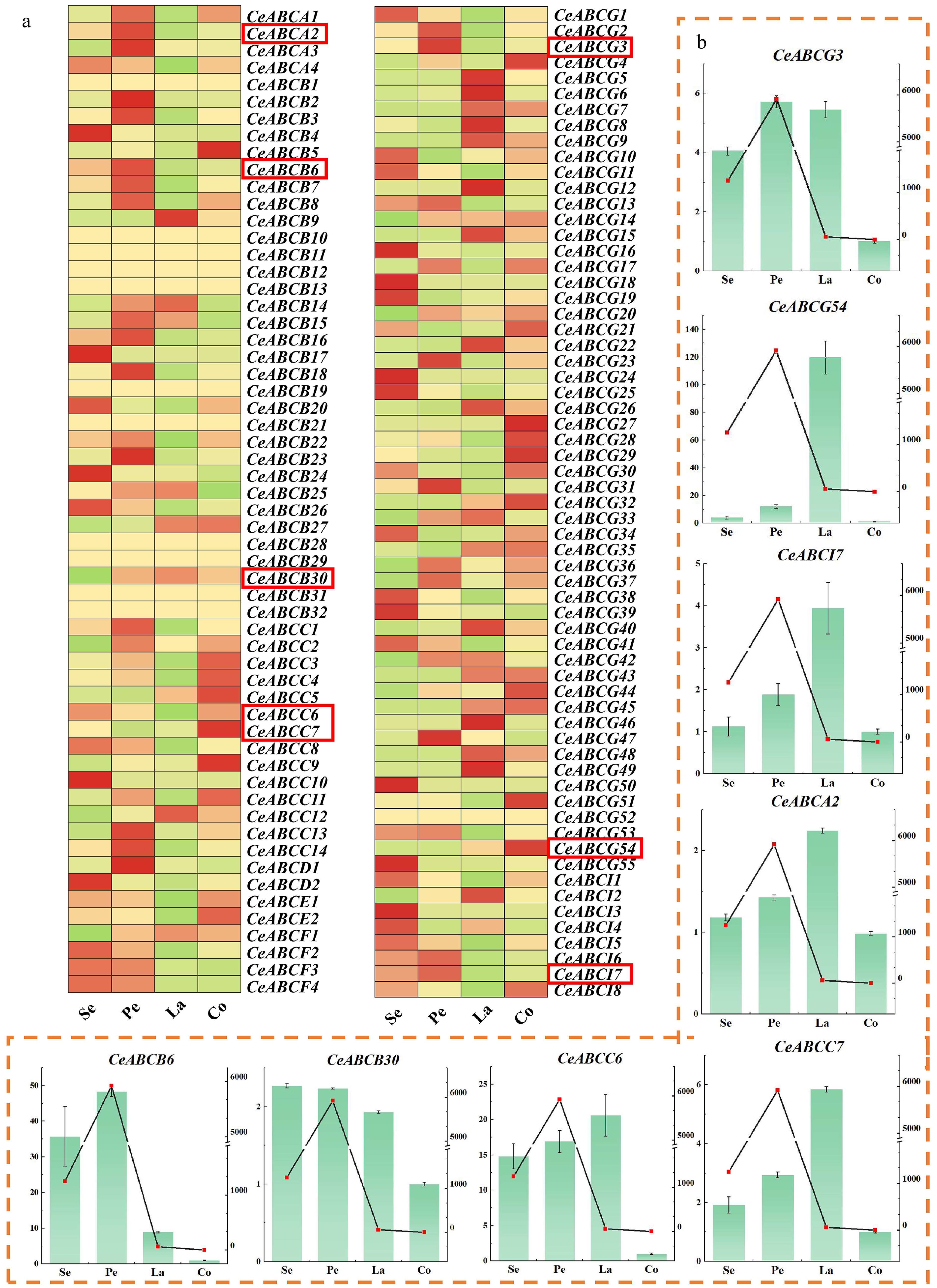 Analysis of gene expression in different organs of flowers during the full bloom stage. (a) Transcriptional expression of the CeABCs gene in different parts during the blooming period of C. ensifolium in the transcriptome. Se, sepal; Pe, petal; La, labellum; Co, column. (b) The relative expression levels of genes in different parts of C. ensifolium were measured. The coordinates on the left and the bar chart indicate the multiple expressions of the gene relative to Co (column). The coordinates on the right and the line graph indicate the release of MeJA in that part.