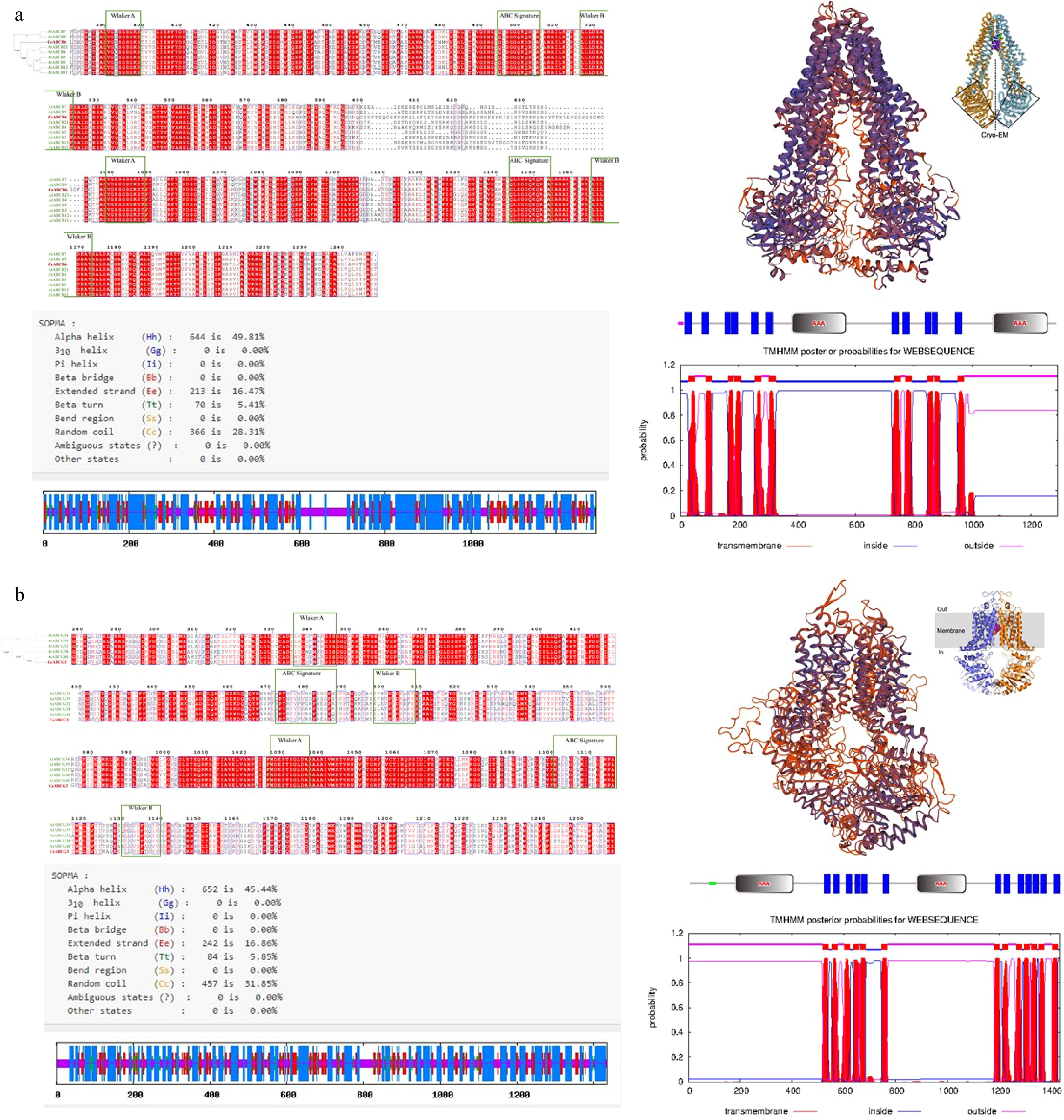• The physicochemical properties of the cloned CeABCB6 and CeABCG3 transporter proteins were analyzed using ProtParam. Structural domains of CeABCB6 and CeABCG3 were predicted using the SMART online tool (http://smart.embl.de/, accessed on 9 December 2023), while transmembrane domains were identified via the TMHMM online tool. Conserved nucleotide and amino acid sequences of all ABC proteins were analyzed using Maximum Likelihood (ML) and Bayesian Inference (BI) methods. The tertiary structures of CeABCB6 and CeABCG3 transporters were modeled using SWISS-MODEL. Homology searches for CeABCB6 and CeABCG3 transporters were performed using the NCBI online BLASTp tool. Multiple sequence alignments were conducted between CeABCB6 and CeABCG3 and their homologous ABC proteins from Orchidaceae species with high sequence similarity. Additionally, phylogenetic trees were constructed to infer protein functions, using CeABCB6 along with 28 A. thaliana ABCB transporters and CeABCG3 with 43 A. thaliana ABCG transporters.
