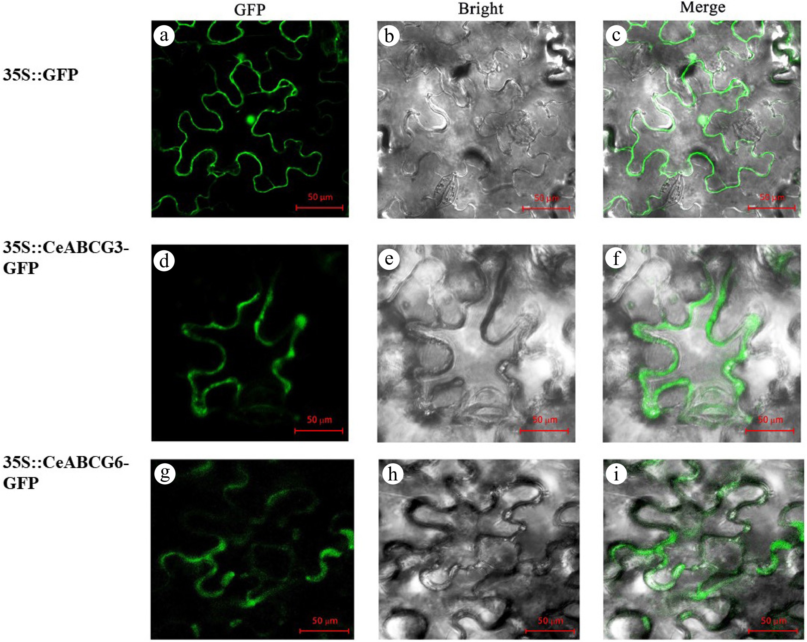 Subcellular localization of CeABCB6-GFP and CeABCG3-GFP fusion proteins in Nicotiana benthamiana leaves. (a)–(c) 1302-GFP control. (d)–(f) 1302-CeABCG3-GFP. (g)–(i) 1302-CeABCB6-GFP. GFP, bright field, and merged channels are shown.