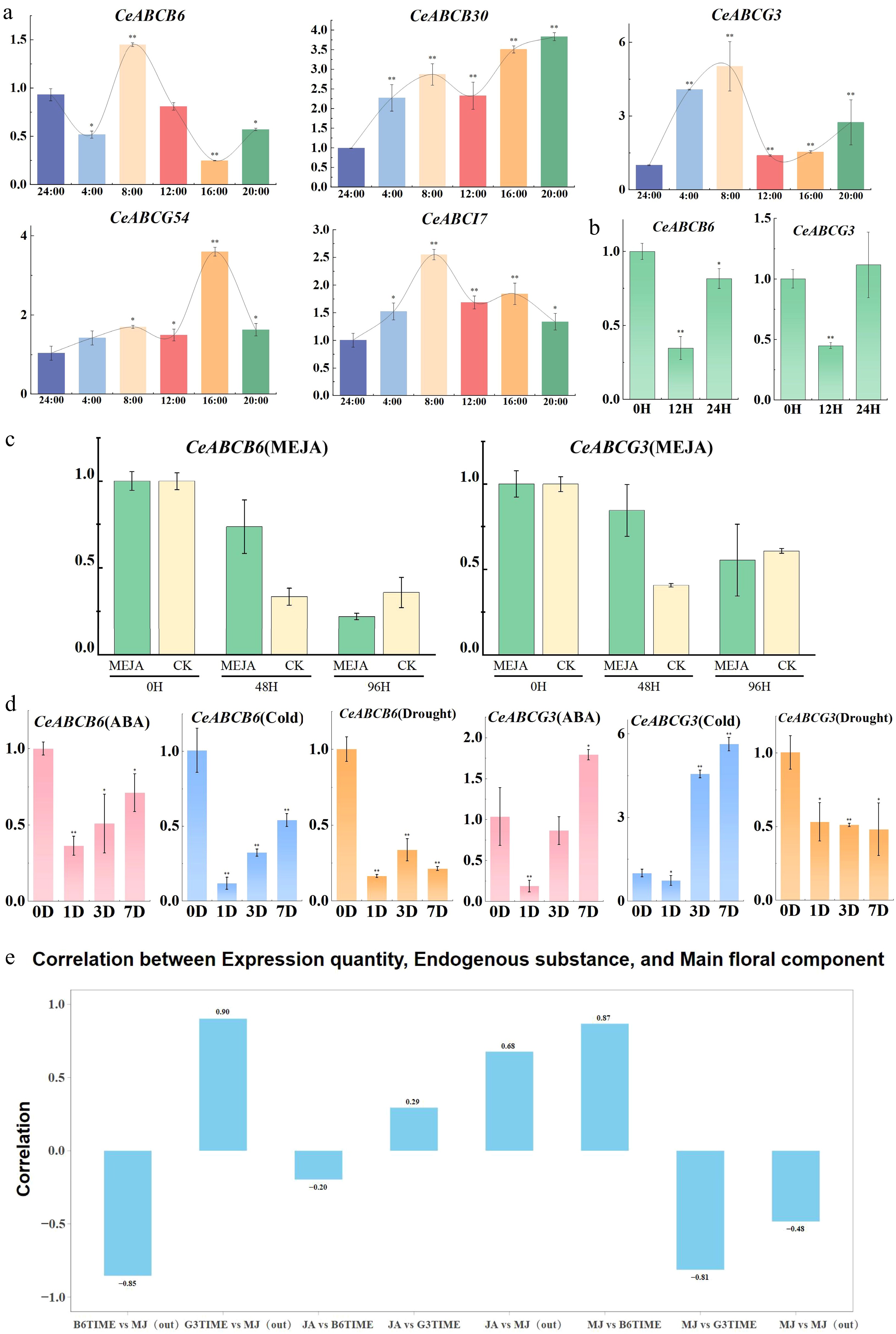 Expression changes of CeABC genes under various conditions and their correlation with MeJA release. (a) Diurnal expression patterns of CeABC genes during flower blooming. (b) Relative expression changes of CeABCB6 and CeABCG3 under short-term MeJA treatment. (c) Relative expression changes of CeABCB6 and CeABCG3 under prolonged MeJA treatment, with CK serving as the untreated control. (d) Expression changes of CeABCB6 and CeABCG3 under various abiotic stresses. (e) Correlation analysis between CeABCB6 and CeABCG3 expression levels and MeJA release during flower blooming.