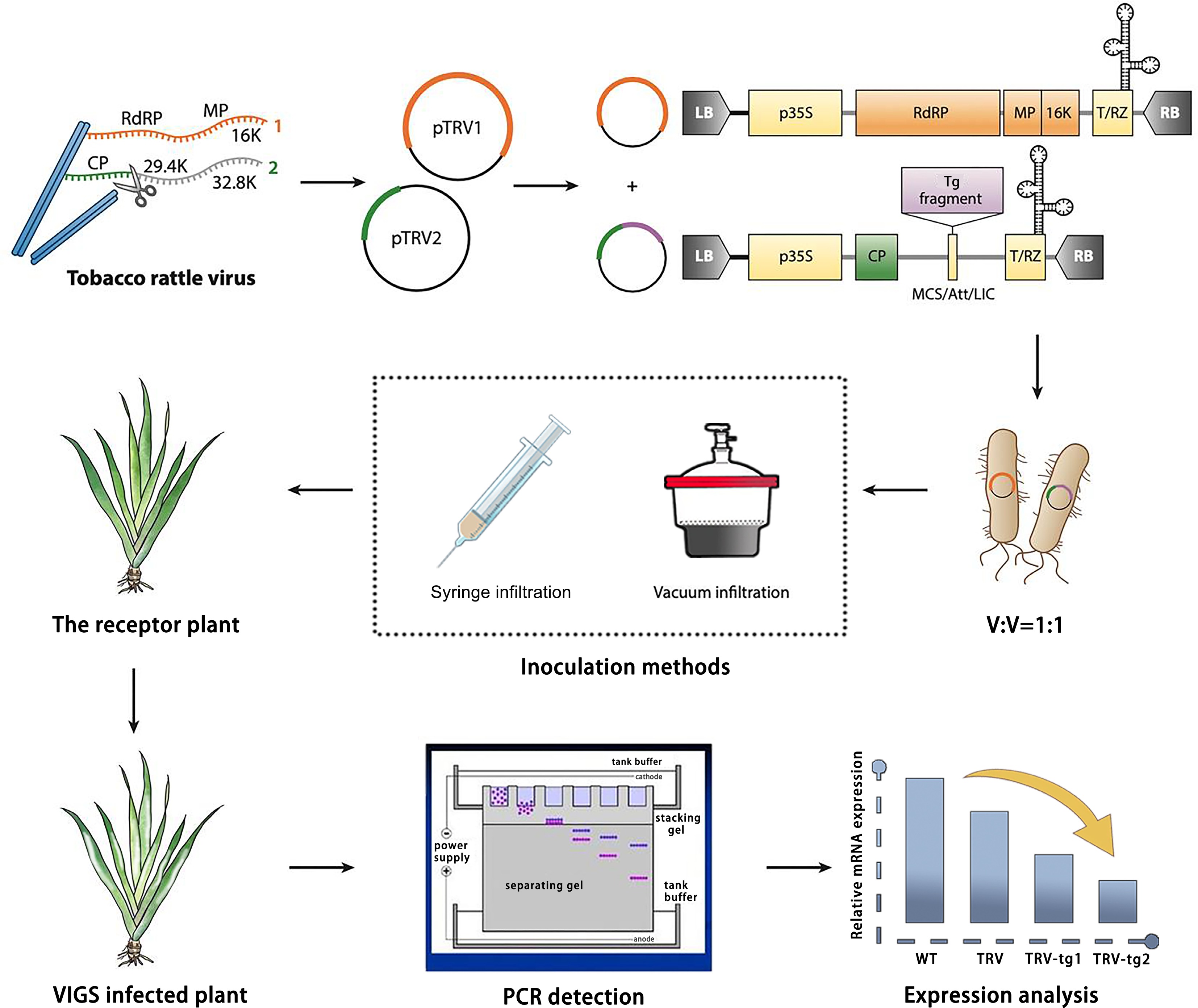 VIGS is a widely utilized transient transfection technique that employs viruses carrying cDNA fragments of target genes to infect plants[16]. It leverages a plant's natural response to viral infections to suppress the expression of specific target genes[17]. Unlike stable genetic transformation, VIGS does not require the generation of stable transgenic lines, making it particularly valuable for species that are difficult to transform. This RNA silencing method operates by using viral vectors to deliver fragments of the target gene into plant cells, where they activate the plant's RNA interference (RNAi) machinery. This results in the degradation of the corresponding mRNA and a subsequent reduction in the expression of the target gene. Recently, several viral vectors have been modified for VIGS to bring a larger collection of monocots under the ambit of this method[18], including Tobacco Mosaic Virus (TMV), Tobacco Rattle Virus (TRV)[19], Foxtail Mosaic Virus (FMS)[20], and Barley Stripe Mosaic Virus (BSMV)[21]. Among these, the TRV vector has gained popularity due to its lighter symptoms of plant viruses, longer duration and higher silencing efficiency, resulting in the induction of gene silencing in a broad range of plant species. It has been successfully applied to both dicots and monocots such as wheat (Triticum aestivum) and maize (Zea mays)[22,23].