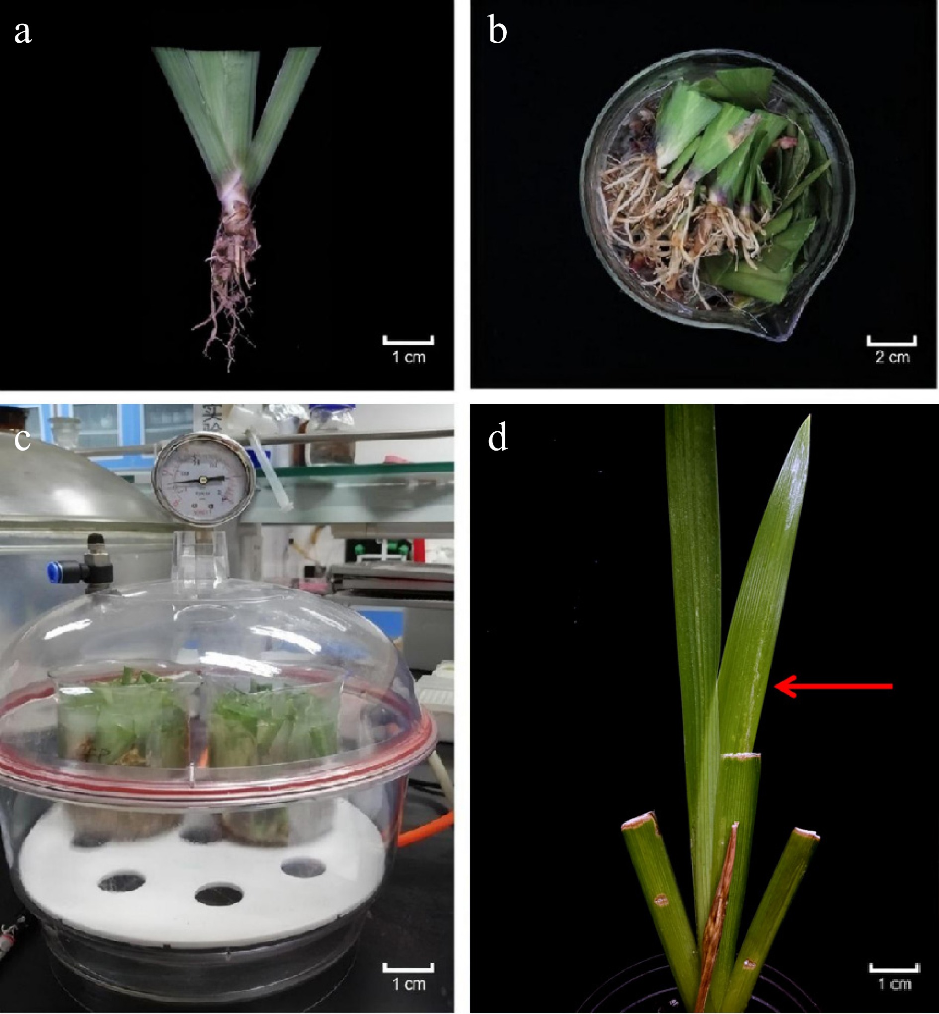 For the inoculation procedure, rhizomes and leaves of I. japonica plants were subjected to infection. The leaves were trimmed to approximately 10 cm in length, and 2–3 punctures were made into the rhizomes or leaf base using toothpicks. Seedlings of different ages were immersed in the infection solution and subjected to vacuum infiltration. Subsequently, the treated plants, along with control plants that did not receive the bacterial solution, were placed in the dark for 3 d and then cultured for an additional 28 d to monitor phenotypic changes (Fig. 3ac).