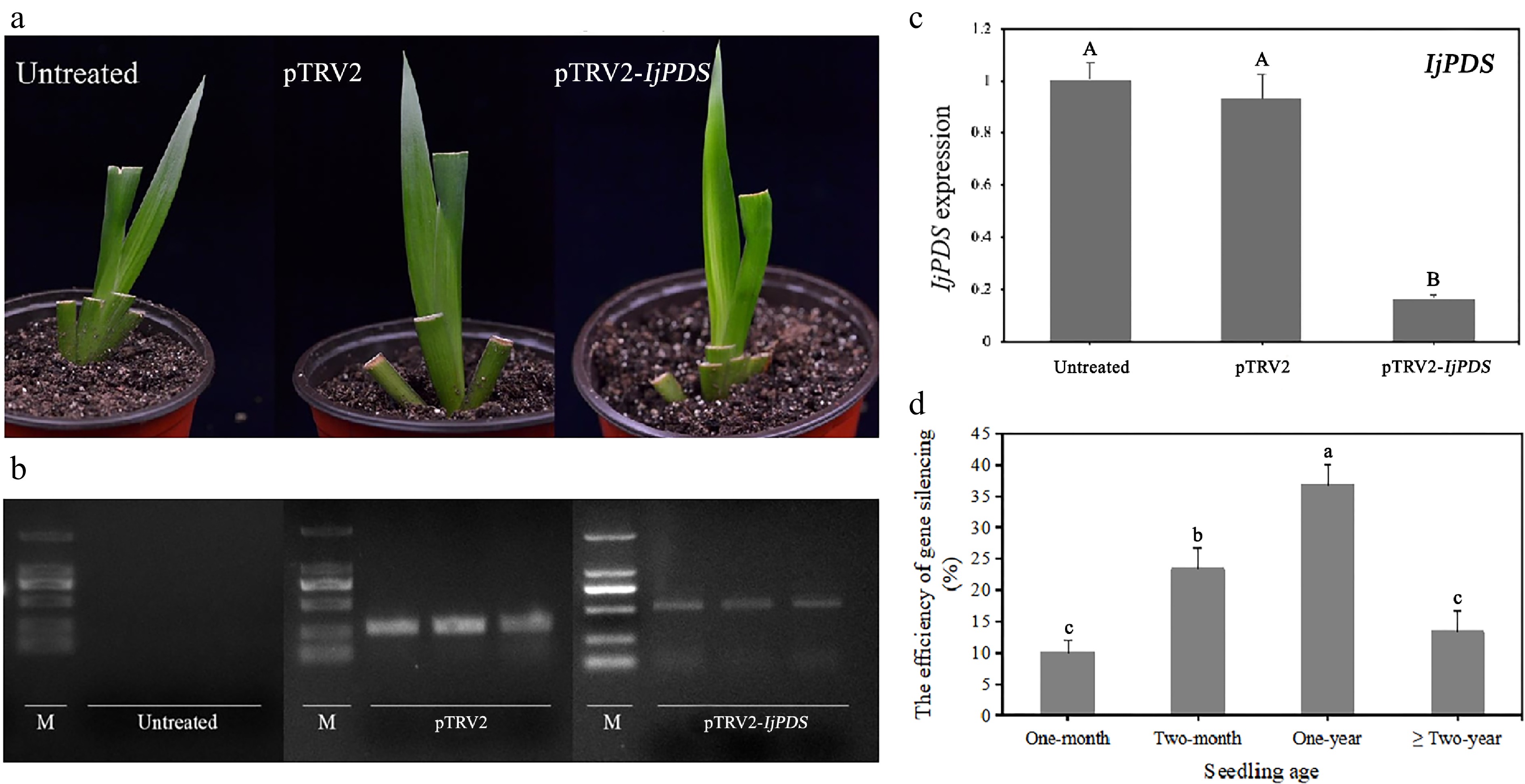 Phenotype and molecular validation of IjPDS silencing in Iris japonica. (a) Phenotypic observations of untreated, pTRV2-treated, and pTRV2-IjPDS-treated I. japonica leaves at 28 d post-infiltration (dpi). A characteristic photobleached phenotype was observed in the newly developed leaves of pTRV2-IjPDS-treated plants at 28 dpi, indicating successful silencing of IjPDS. (b) RT-PCR analysis of PDS expression in I. japonica leaves at 28 dpi from untreated, pTRV2-treated, and pTRV2-IjPDS-treated plants. A larger specific band was observed in the pTRV2-IjPDS-treated leaves compared to the pTRV2-treated leaves, confirming the infection of the pTRV2-IjPDS vector. In contrast, there is no TRV band detected in untreated plants. (c) Quantitative real-time PCR (qPCR) analysis of PDS expression in I. japonica leaves at 28 dpi from untreated, pTRV2-treated, and pTRV2-IjPDS-treated plants. Reduced PDS expression was detected in the pTRV2-IjPDS-treated plants, confirming successful silencing of IjPDS in I. japonica leaves. (d) Comparison of infection efficiency at different seedling ages, demonstrating the optimal age for successful silencing in I. japonica. Each age group consists of three sets of uniformly growing plants, with ten plants per set. The data represent the mean values ± standard error. Different letters in (c) and (d) indicate significant differences at p < 0.05, following statistical analysis by ANOVA.
