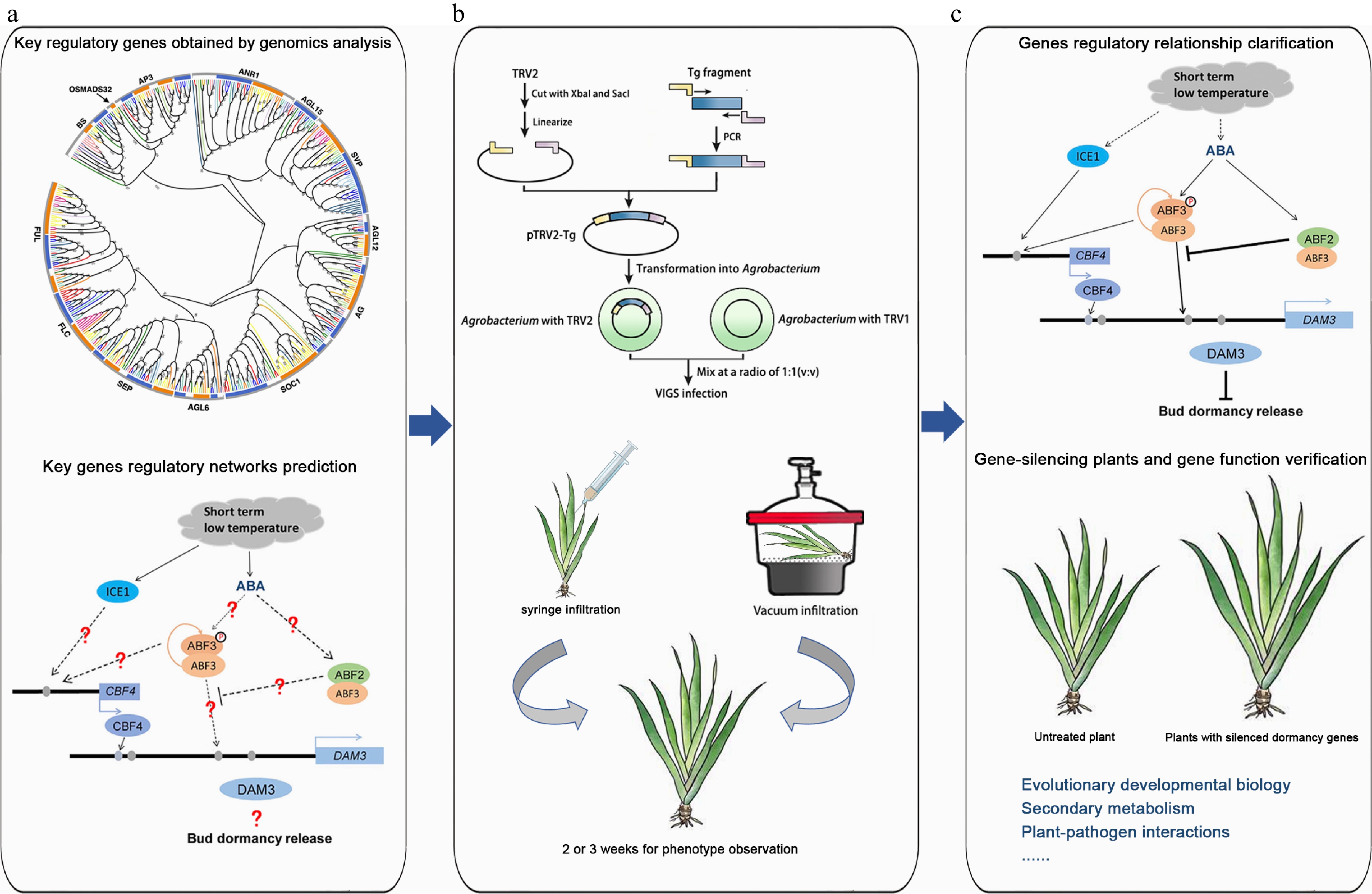 • Following the successful establishment of the TRV-mediated VIGS system in I. japonica, its application in related research was explored. Transcriptomic and genomic analyses were performed to predict key genes involved in specific biological processes (Fig. 7a). Using gene phylogenetic analysis, conserved domain sequence comparison, and bioinformatics tools, target genes were identified and their full-length sequences determined. The TRV-VIGS system was then employed for transient gene function verification, with target gene fragments inserted into the TRV vector and introduced into Iris via Agrobacterium-mediated methods (Fig. 7b). The viral spread and replication induced gene silencing, leading to the inhibition of target gene expression. By comparing phenotypic, physiological, and biochemical differences between gene-silenced plants and controls, as well as analyzing the predicted downstream gene expression, the function of the target genes were confirmed and their regulatory mechanisms elucidated (Fig. 7c). This approach also enabled the investigation of gene regulatory relationships and the construction of a gene regulation network.