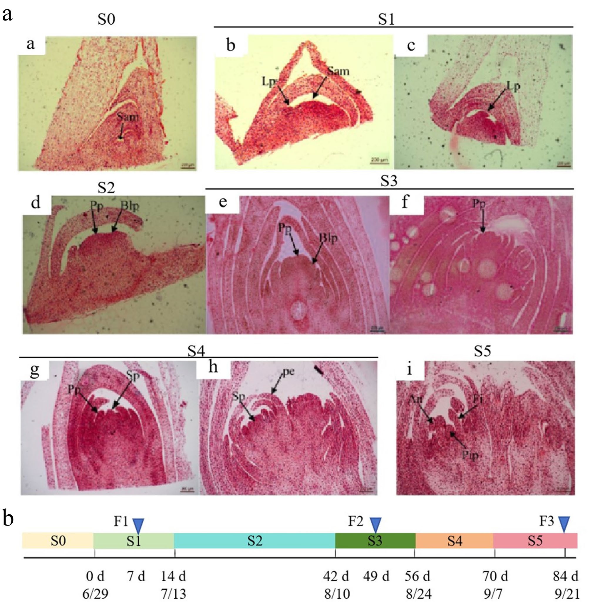 Morphological characterization of floral bud differentiation in Fritillaria pallidiflora. a: Floral bud development was classified into six distinct stages (S0–S5) based on morphological characteristics. (a) Undifferentiated phase (S0). (b), (c) Bract primordium differentiation phase (S1). (d) Floral primordium formation phase (S2). (e), (f) Petal primordium differentiation phase (S3). (g), (h) Stamen primordium differentiation phase (S4). (i) Pistil primordium differentiation phase (S5). An: anther; Blp: bract leaf primordium; Fi: filament; Lp: leaf primordium; Pe: petal; Pip: pistil primordium; Pp: petal primordium; Sam: shoot apical meristem; Sp: stamen primordium. Scale bars: 200 μm. b: Sampling time line. F1, F2, and F3 represent three samples corresponding to the three representative developmental stages (S1, S2, and S3) of floral buds. F1 represents the sample from the S1 stage, sampled after 7 d of treatment (on July 6); F2 represents the sample from the S3 stage, sampled after 49 d of treatment (on August 17); F3 represents the sample from the S5 stage, sampled after 84 d of treatment (on September 21).