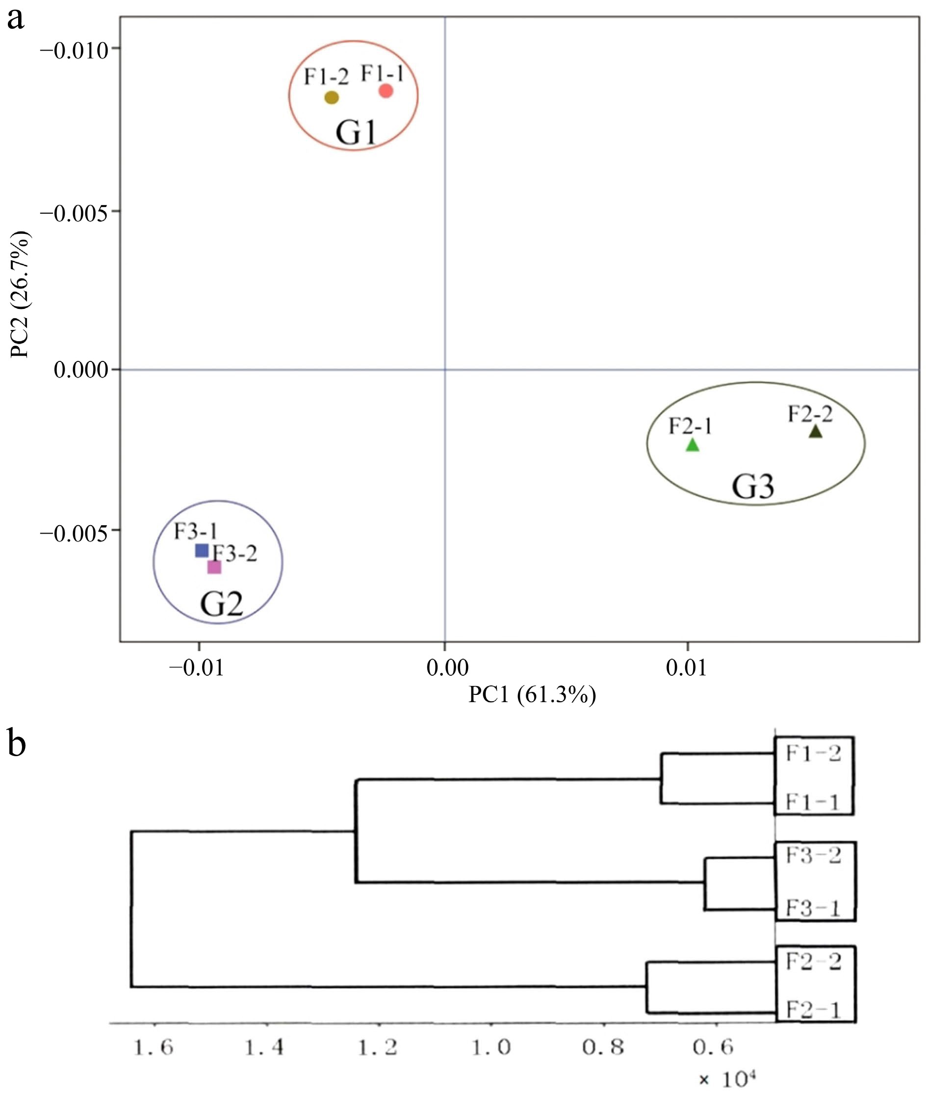 (a) Principal component analysis (PCA) of each sample, and (b) cluster analysis of expression levels of samples. F1-1 and F1-2, F2-1 and F2-2, F3-1 and F3-2 represent two biological replicates for each sample respectively.