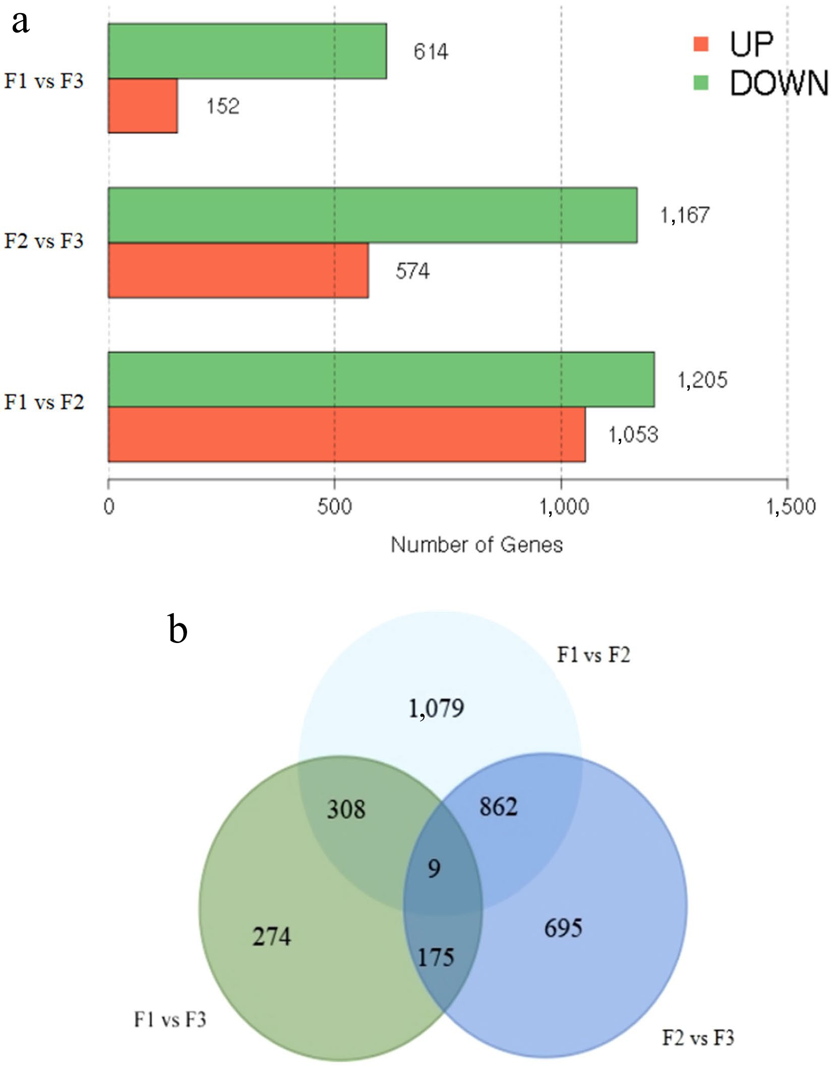 • Clean reads were aligned to unigenes, and expression levels were estimated using the FPKM method. Three comparative groups, F1 vs F2, F2 vs F3, and F1 vs F3, were established to analyze the DEGs during floral bud development. In the F1 vs F2 group, 2,258 DEGs were identified, with 1,053 unigenes significantly up-regulated and 1,205 genes significantly down-regulated (Fig. 3a). In the F2 vs F3 comparison, there were 1,741 DEGs: 574 were up-regulated and 1,167 were down-regulated (Fig. 3a). In the F1 vs F3 comparison, there were 766 DEGs: 152 were up-regulated and 614 were down-regulated (Fig. 3a). As illustrated in a Venn diagram (Fig. 3b), a total of 3,402 DEGs were detected from three comparative groups, including nine common DEGs, and 1,079, 695, and 274 DEGs specifically expressed in F1 vs F2, F2 vs F3, and F1 vs F3, respectively.