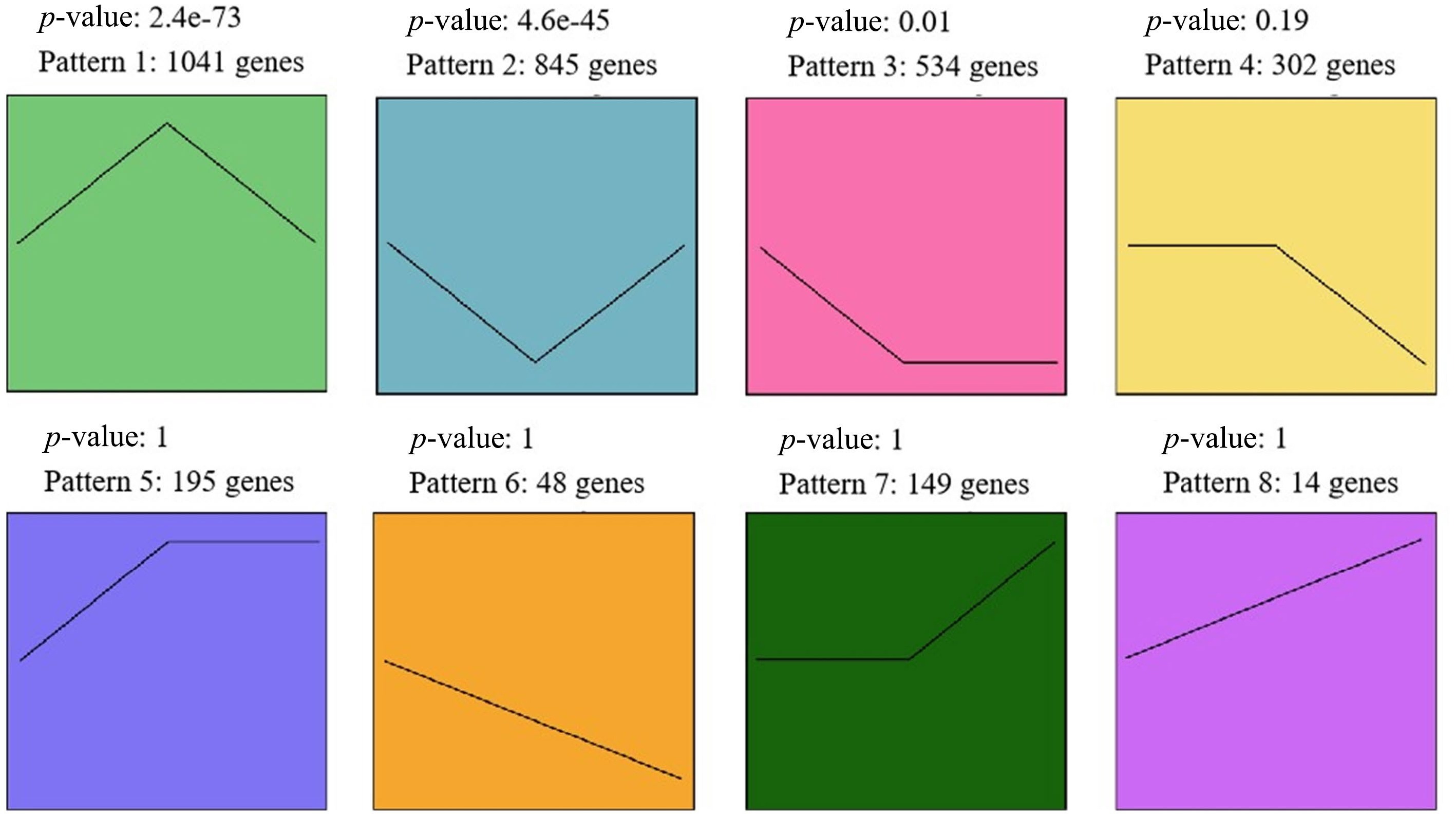Eight expression patterns across the three stages. Genes in pattern 1 were significantly up-regulated during F2 compared to F1 and F3; genes in pattern 2 were significantly down-regulated during F2 compared to F1 and F3.