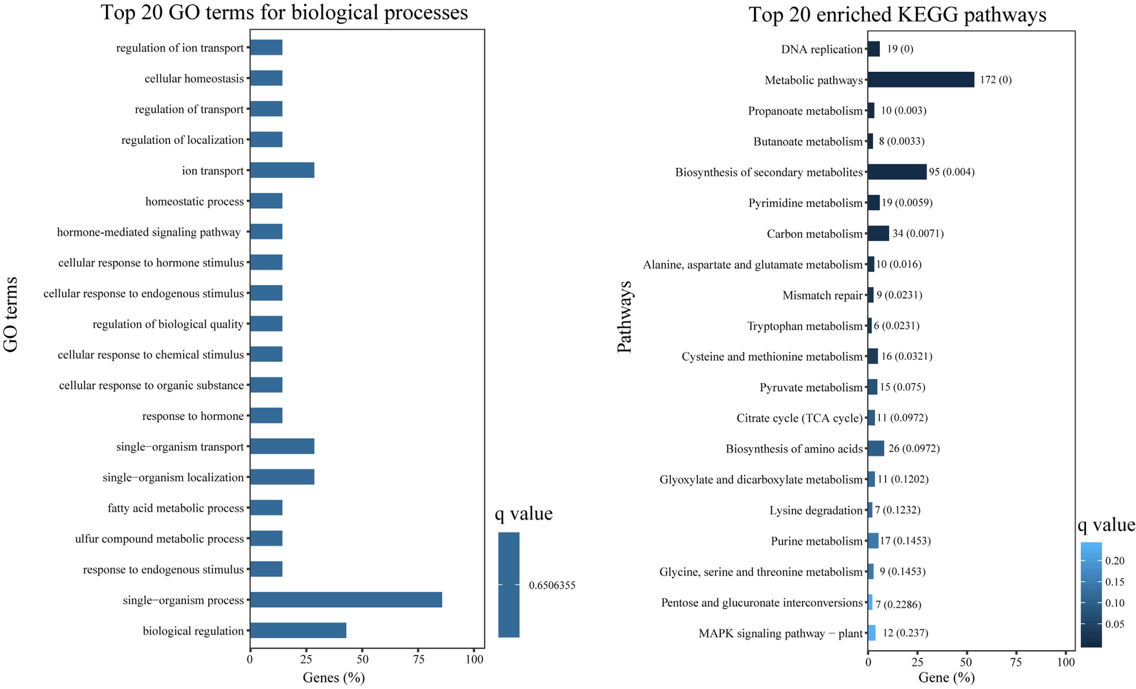 • To investigate the functions of DEGs in expression patterns 1 and 2, GO and KEGG enrichment analyses were conducted. DEGs from expression patterns 1 and 2 were primarily clustered into GO terms associated with hormones, signals, secondary metabolism and regulation, including 'hormone-mediated signaling pathway' (GO:0009755), 'cellular response to hormone stimulus' (GO:0032870), 'signal transduction' (GO:0007165), 'signaling' (GO:0023052), 'metabolic process' (GO:0008152), 'cellular metabolic process' (GO:0044237), and 'regulation of transport' (GO:0051049) (Fig. 5a). KEGG analysis revealed that a significant number of DEGs were enriched in metabolism-related pathways, such as 'biosynthesis of secondary metabolites' (ko01110), 'carbon metabolism' (ko01200), and 'cysteine and methionine metabolism' (ko00270). Additionally, numerous DEGs were found to be enriched in signal transduction-related pathways, including 'plant hormone signal transduction' (ko04075), and 'MAPK signaling pathway-plant' (ko04016) (Fig. 5b).
