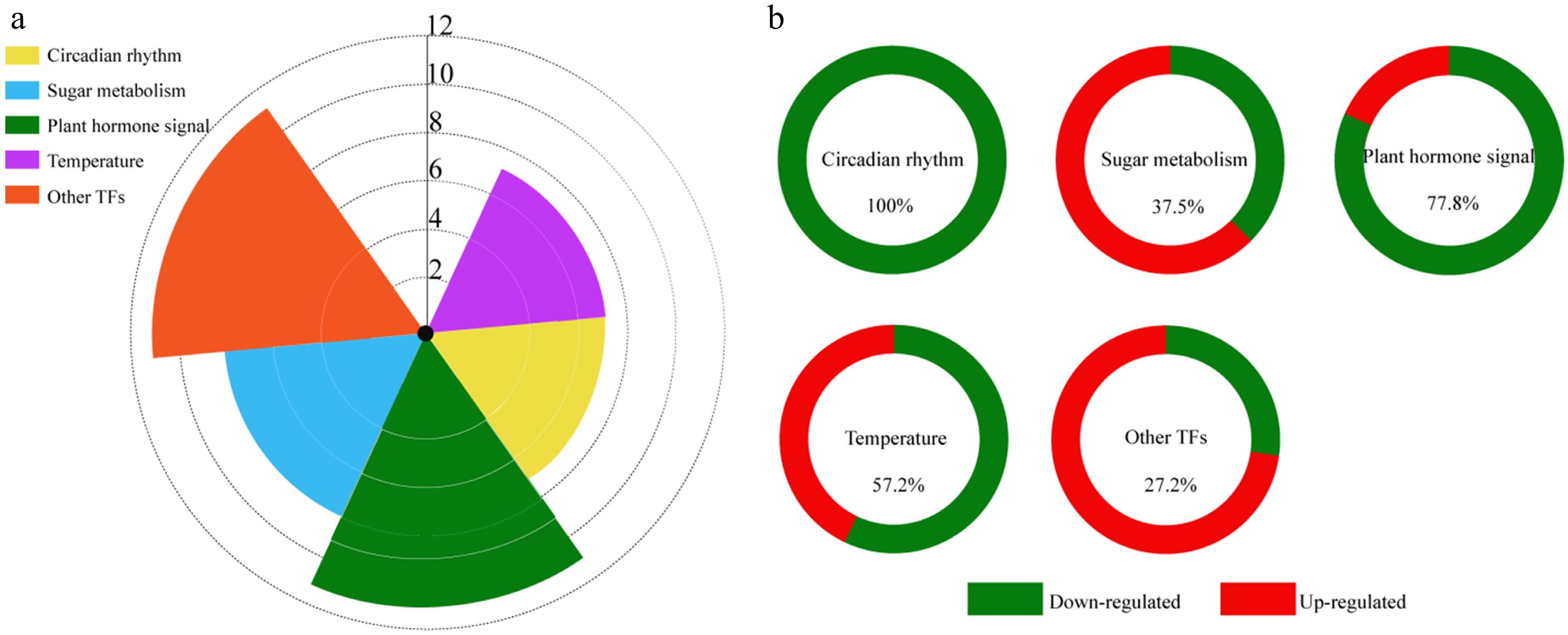 • In the present study, utilizing DEG enrichment with GO and KEGG analyses for patterns 1 and 2, a total of 44 unigenes potentially associated with floral bud differentiation were identified. These unigenes were categorized into five groups: circadian rhythm (seven genes), carbohydrate metabolism (eight genes), plant hormones (11 genes), temperature (seven genes), and other TFs (11 genes) (Fig. 6a).