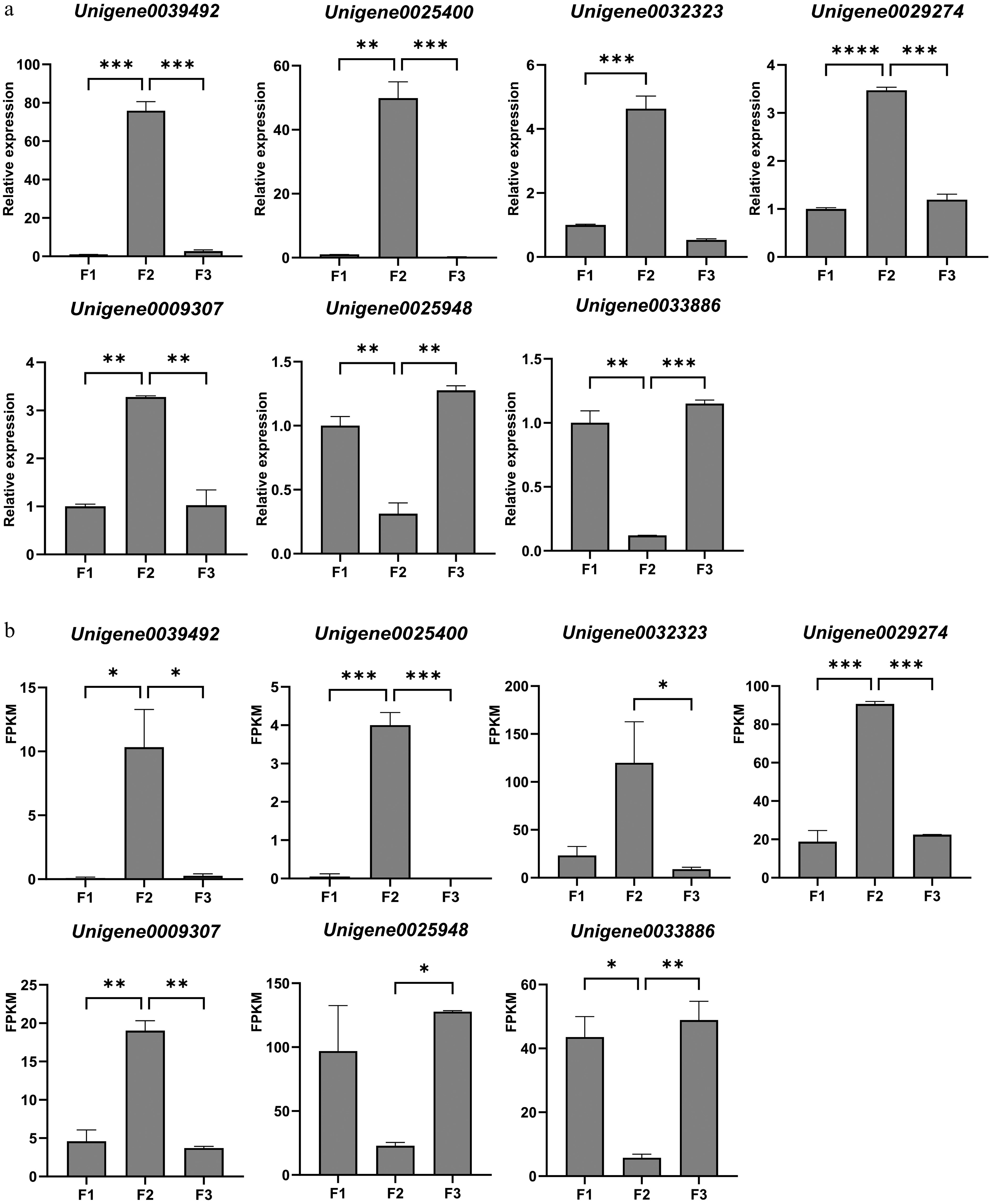 Validation of the expression of selected DEGs from transcriptome data by qRT-PCR. (a) Relative expression results of qRT-PCR. (b) The FPKM value obtained from the transcriptome data. Values are means of three independent biological samples and each sample contains three plants. Error bars represent standard deviations and the statistical analysis was conducted using the Student's t-test. * denotes statistical significance, with the number of '*' corresponding to the level of significance (* p < 0.05; ** p < 0.01; *** p < 0.001; **** p < 0.0001).