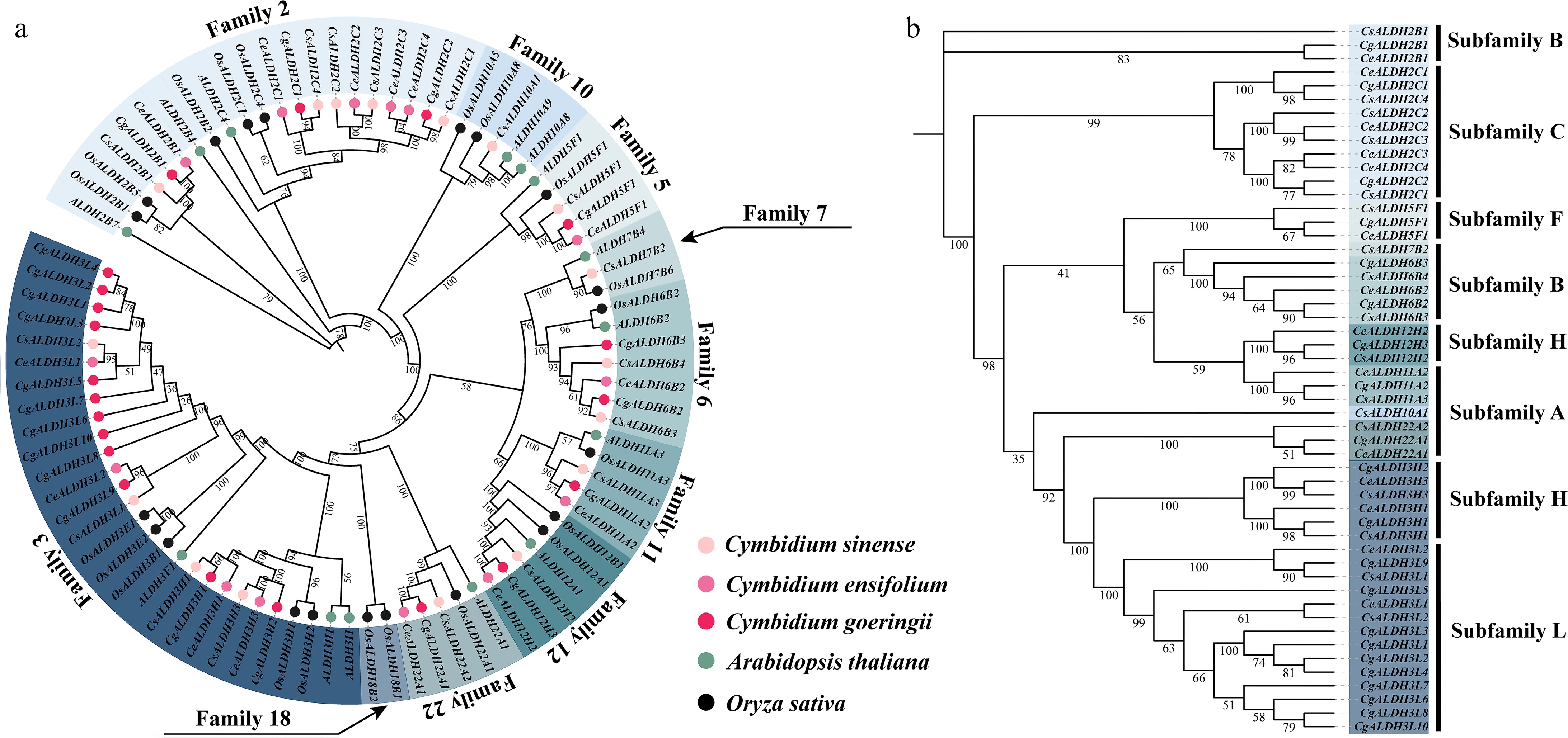 Phylogenetic analysis of ALDH family members. (a) Phylogenetic tree constructed using ALDH family members from C. sinense, C. ensifolium, C. goeringii, A. thaliana, and O. sativa. (b) In the phylogenetic tree derived from C. sinense, C. ensifolium, and C. goeringii, the text on the right indicates the classification of protein subfamilies. These subfamilies are categorized into seven groups (A, B, C, F, H, and L), with subfamily L being a newly identified group in this study.