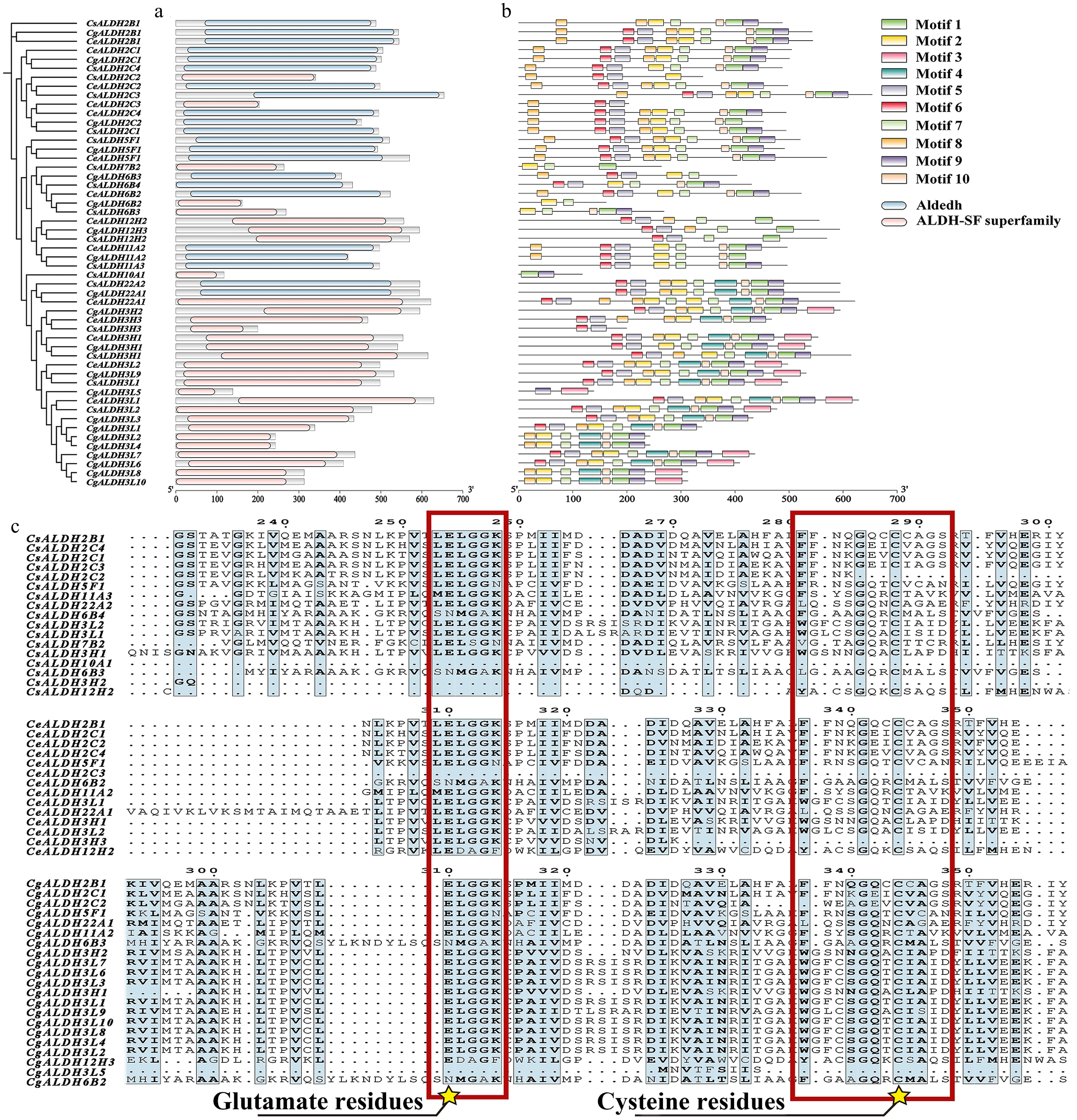Conserved domain analysis and multiple sequence alignment of the CsALDH, CeALDH, and CgALDH gene families. (a) Conserved domains, where blue represents the Aldedh domain (PF00171) and pink represents the ALDH-SF superfamily domain (PF00171). (b) Motifs of proteins, with different colors representing distinct motifs numbered from 1 to 10. The scale at the bottom allows for estimation of protein lengths. (c) Multiple sequence alignment of all identified proteins. Conserved motifs and active sites of glutamic acid residues and conserved motifs and active sites of cysteine residues are marked with red squares and yellow star symbols.