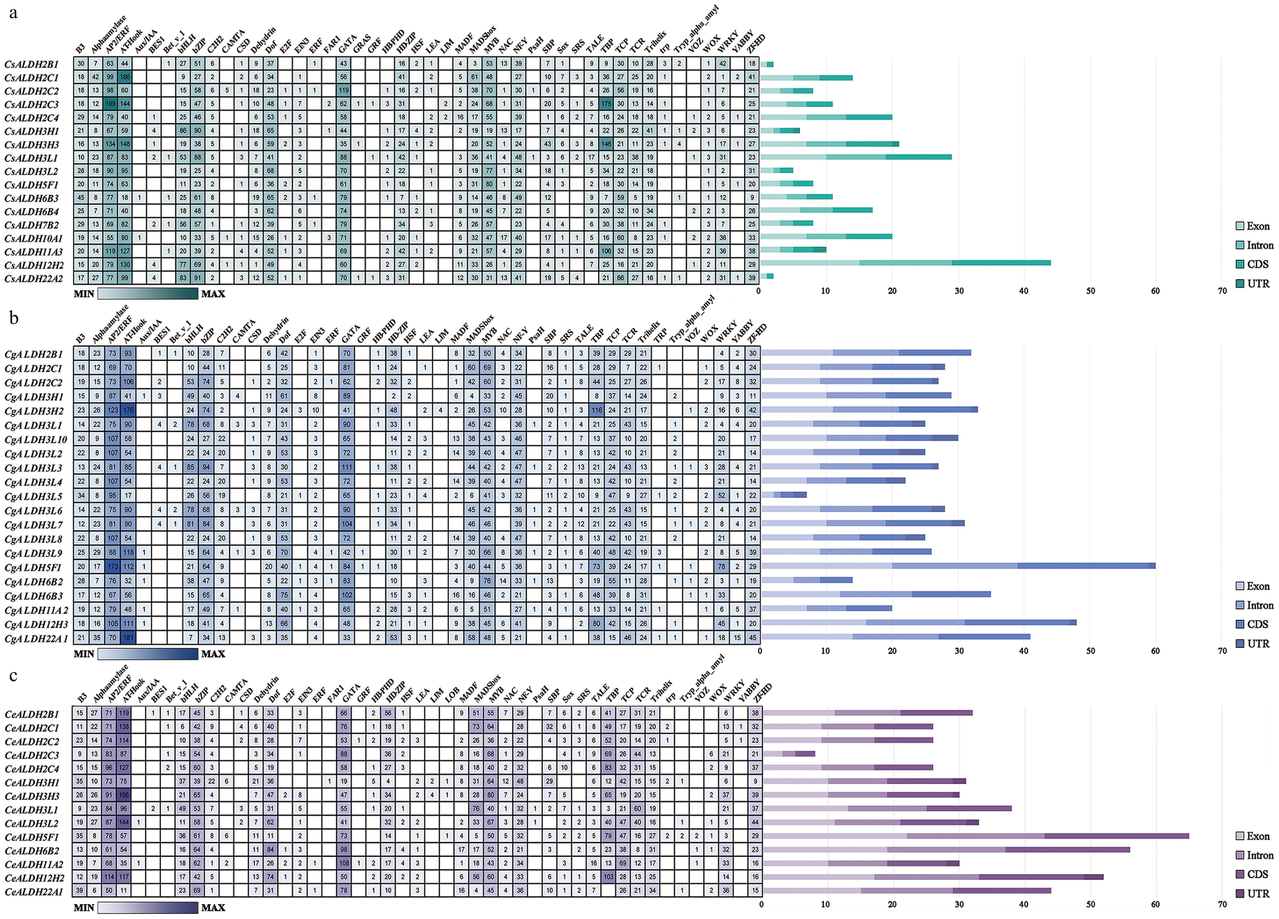 Furthermore, we examined the structure and quantity of introns, exons, CDSs, and UTRs (Fig. 3). Most members contain at least one exon and intron, except for CsALDH22A2 and CsALDH2B1, which lack introns. Most members of the CsALDH and CeALDH families do not contain UTRs. Among the CgALDHs, 33.3% members (7/21) lack UTRs, while the remaining members have one to four UTRs.