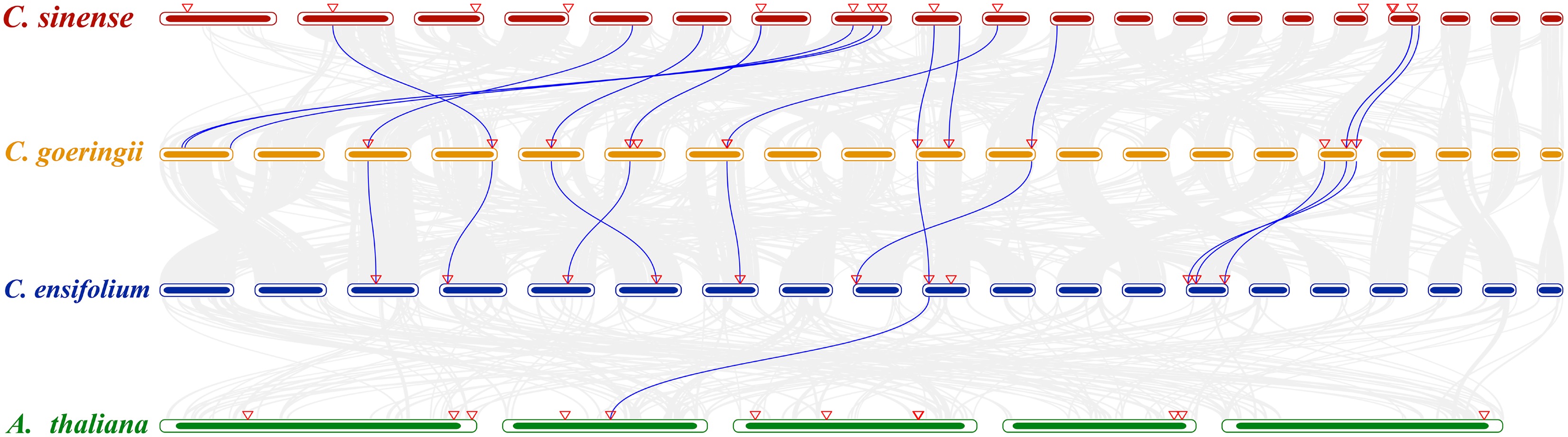 Collinearity analysis between C. sinense, C. goeringii, C. ensifolium, and A. thaliana. The chromosomes of orchids are arranged from left to right as Chr01 to Chr20. The chromosomes of A. thaliana are arranged from left to right as Chr01 to Chr05. The gray lines in the background indicate collinear blocks within the three genomes. The blue lines highlight syntenic ALDH pairs. Red triangles indicate ALDH localization.