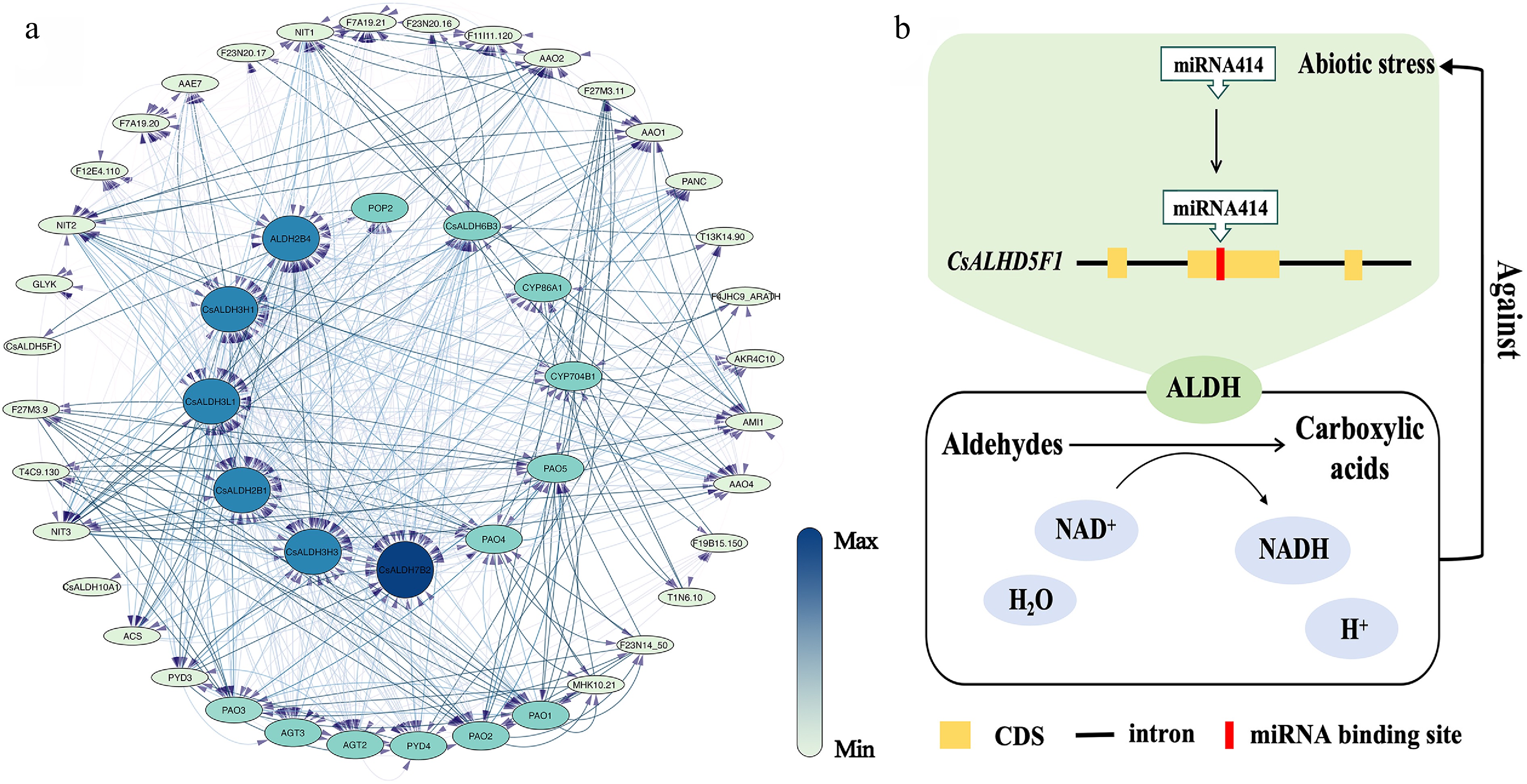 (a) The PPI network of CsALDH. Each ellipse represents a protein, and lines connect pairs of interacting proteins. The strength of the interactions can be estimated using the color bar on the right. (b) Response pattern diagram of CsALDH5F1 under abiotic stress.